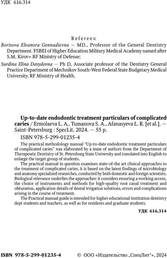💳 Оплатить за товар можно при получении 🇰🇿 Есть бесплатная доставка по Казахстану от 1 дня 🎁 Копите бонусы с каждой покупки The practical methodology manual «Up-to-date endodontic treatment particulars of complicated caries» was elaborated by a team of authors from the Department of Therapeutic Dentistry of St. Petersburg State University and translated into English to enlarge the target group of students. The practical manual in question examines state-of-the art clinical approaches to the treatment of complicated caries, it is based on the latest findings of microbiology and anatomy specialized researches, conducted by both domestic and foreign scientists. Biological relevance underlies the approaches: it considers ensuring a working access, the choice of instruments and methods for high-quality root canal treatment and obturation, application details of dental irrigation solutions, errors and complications arising in the course of treatment. |