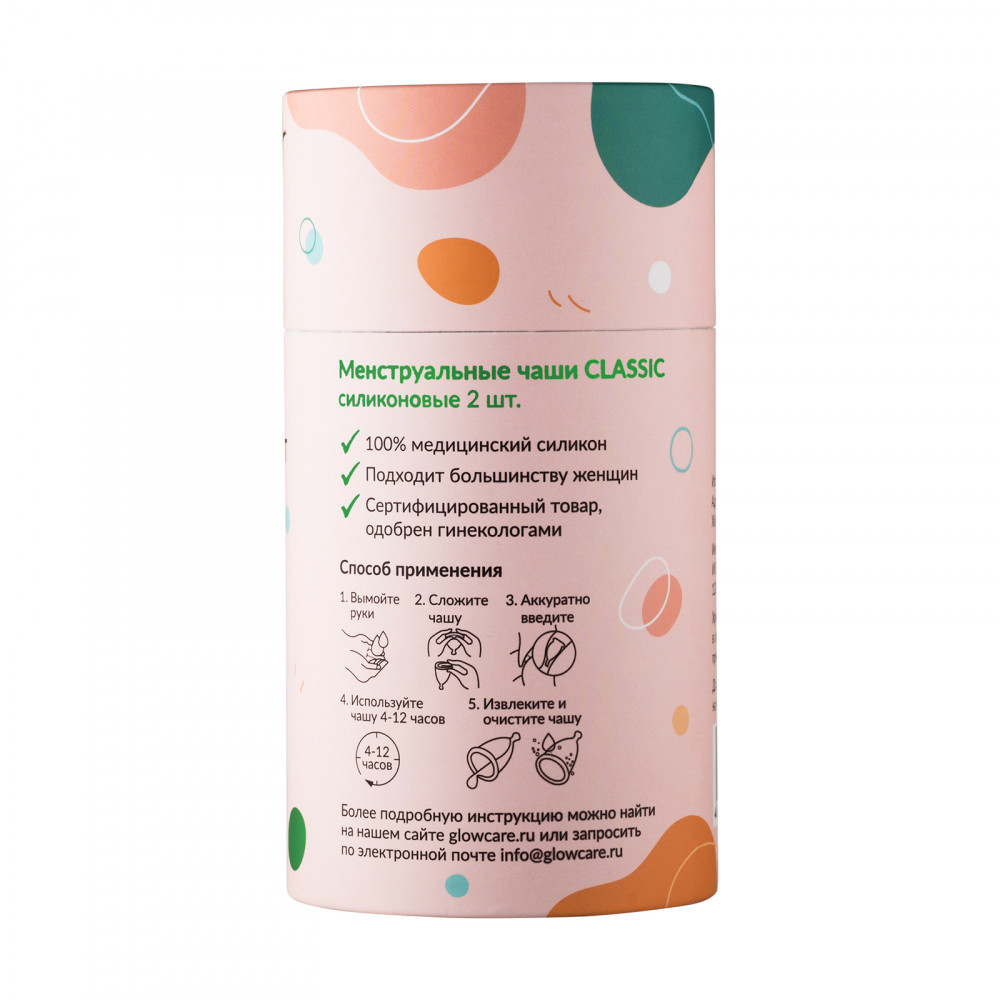 Менструальные чаши Glow Care — это абсолютно безопасная и идеальная альтернатива женским одноразовым тампонам и прокладкам. Выбирая многоразовые менструальные чаши, Вы не только экономите значительную сумму денег, но и заботитесь об окружающей среде. Чаши Glow Care отвечают всем стандартам качества. Они изготовлены из 100% медицинского силикона, инертного ко всем средам, что позволяет исключить размножение бактерий на его поверхности при правильном уходе. Анатомическая форма изделия подходит большинству женщин и абсолютно неощутима внутри. Чаша вмещает в 2 раза больше, чем тампон для обильной менструации и выдерживает до 8 часов непрерывного ношения.