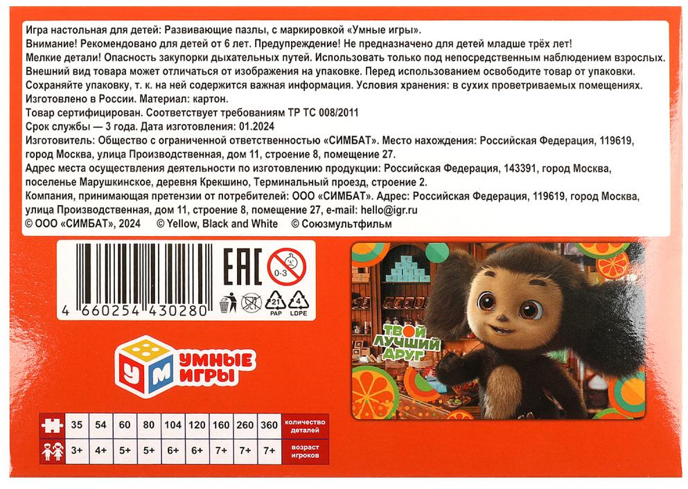 💳 Оплатить за товар можно при получении 🇰🇿 Есть бесплатная доставка по Казахстану от 1 дня 🎁 Копите бонусы с каждой покупки Серия: Чебурашка Классические пазлы в коробке «Чебурашка. Твой лучший друг» ТМ «Умные игры» непременно понравятся юным любознайкам. |
