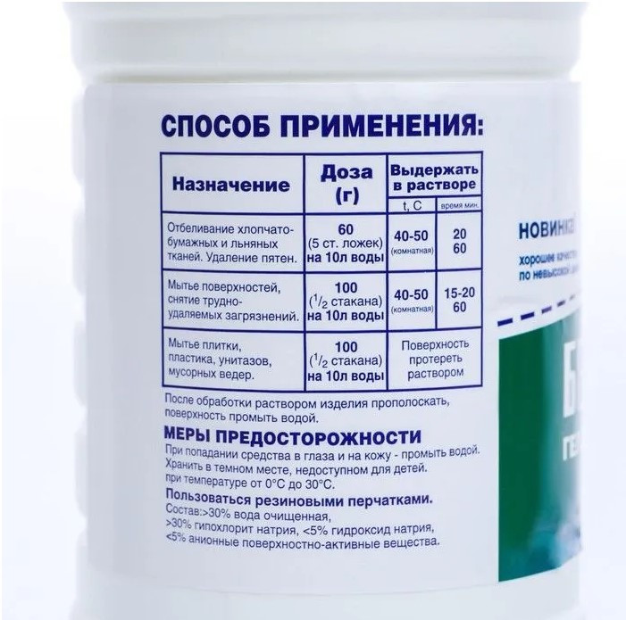 Меры предосторожности: пользоваться резиновыми перчатками. При попадании средства в глаза и на кожу — промыть водой.