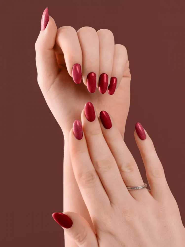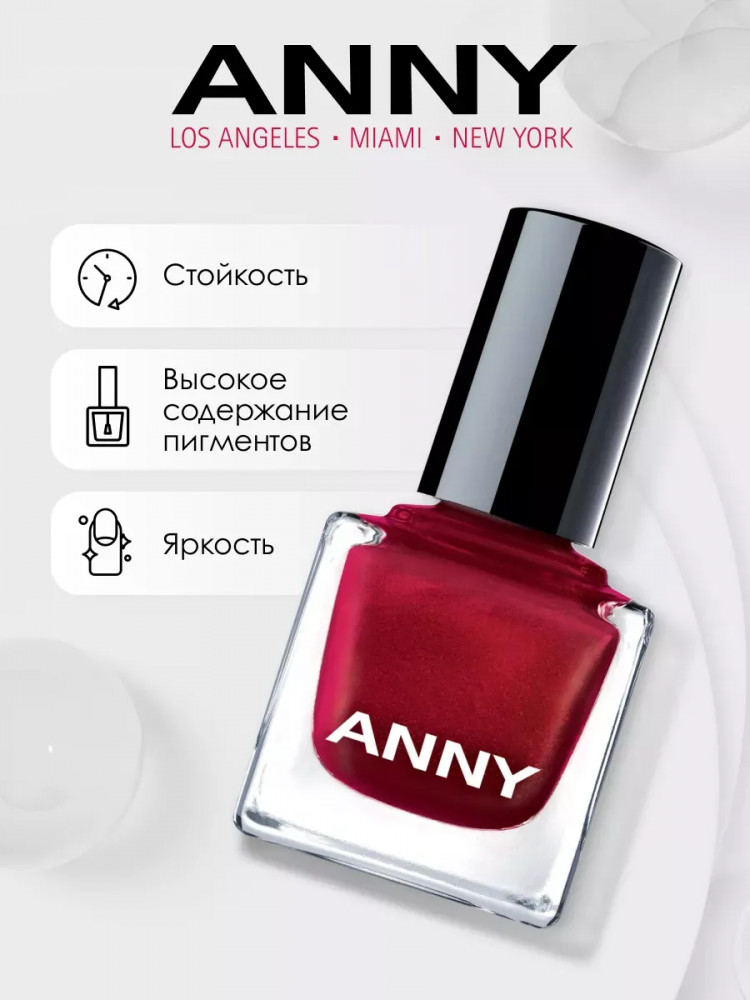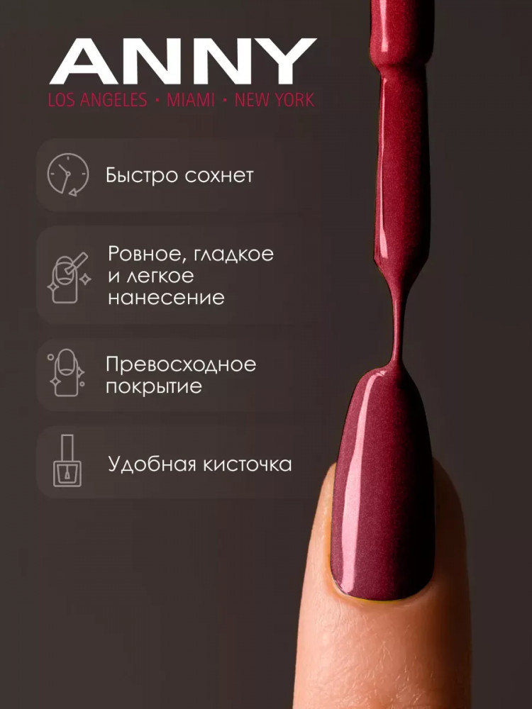Очень красивый, сложный оттенок с красным и розовым микро-шиммером. Цвет: что-то среднее между бордовым и фиолетовым в зависимости от освещения. Отличное качество, как и у всех лаков от ANNY, примерно на пятый день слегка затираются кончики