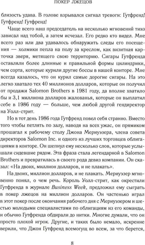 💳 Оплатить за товар можно при получении 🇰🇿 Есть бесплатная доставка по Казахстану от 1 дня 🎁 Копите бонусы с каждой покупки «Покер лжецов» — полуавтобиографическая книга бывшего сотрудника инвестиционного банка Salomon Brothers, а ныне известного журналиста и автора бестселлеров Майкла Льюиса. Автор описывает свою головокружительную карьеру от простого стажера до успешного трейдера, зарабатывающего миллионы долларов на одной сделке. Майкл Льюис знакомит читателей с крупнейшими торговыми площадками середины 1980-х годов, когда Salomon Brothers был на пике своего могущества. Значительное место в повествовании отводится ключевым фигурам банка — Льюису Раньери и Джону Гутфренду, которые считаются одними из виновников самой суровой рецессии в мировой экономике за последние десятилетия. Подробный рассказ о тонкостях работы в сфере инвестиционных банков, о выживании на алчном и амбициозном рынке облигаций будет интересен состоявшимся профессионалам и начинающим игрокам. Увлекательный сюжет, изложенный в не принужденной манере, значительно расширяет круг читателей. |