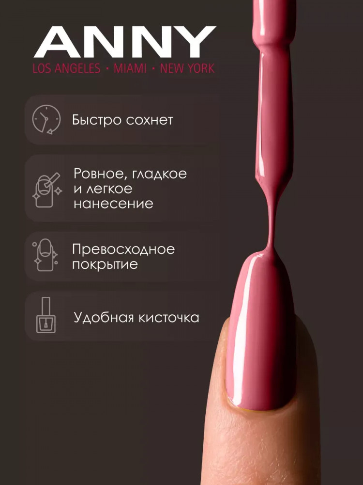 Очень красивый, сложный оттенок с красным и розовым микро-шиммером. Цвет: что-то среднее между бордовым и фиолетовым в зависимости от освещения. Отличное качество, как и у всех лаков от ANNY, примерно на пятый день слегка затираются кончики