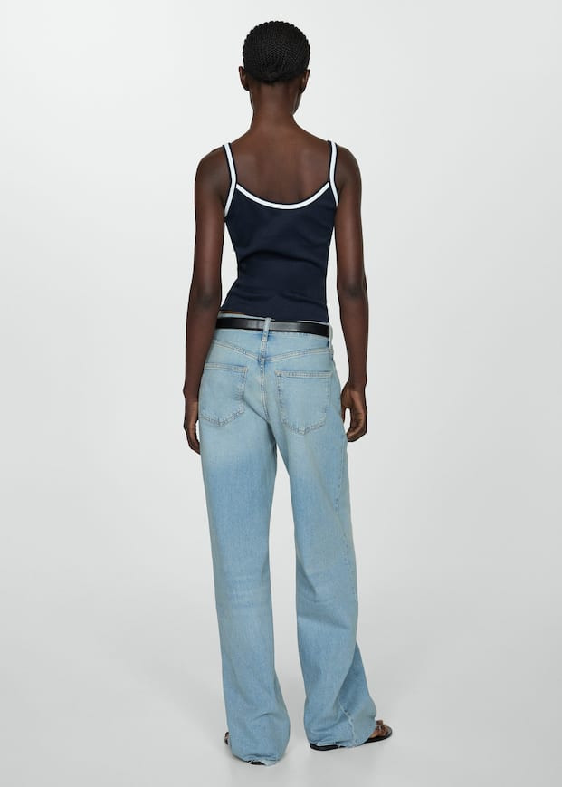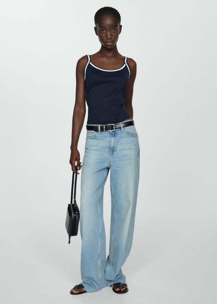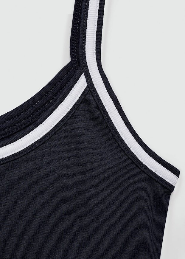 Яркий! Трикотаж плотный! Можно спокойно носить с бюстгальтером - лямки майки закрывают лямки бюстгальтер.