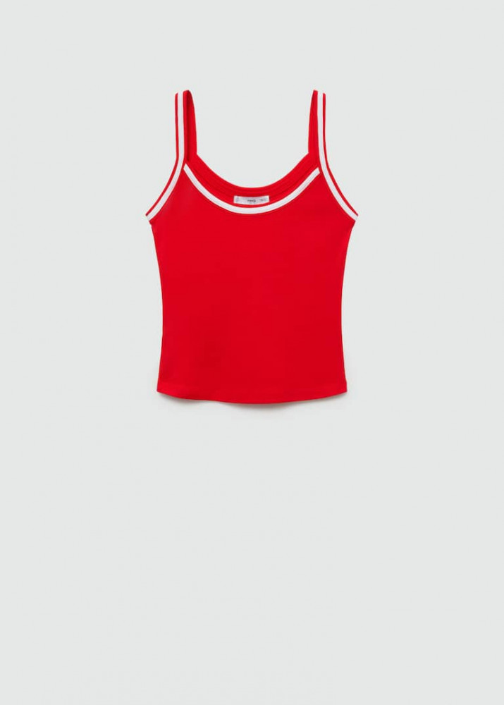Яркий! Трикотаж плотный! Можно спокойно носить с бюстгальтером - лямки майки закрывают лямки бюстгальтер.