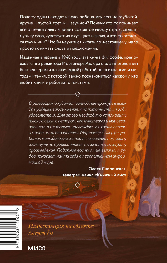💳 Оплатить за товар можно при получении 🇰🇿 Есть бесплатная доставка по Казахстану 🎁 Копите бонусы с каждой покупки Переиздание легендарной книги Мортимера Адлера — о том, как на самом деле читать книги. В красивой обложке от иллюстратора Август Ро. Почему одни находят какую-либо книгу весьма глубокой, другие — пустой, третьи — заумной? Почему, перечитывая книгу, вы каждый раз обнаруживаете что-то не замеченное ранее? Почему кто-то понимает все оттенки смысла, видит сокрытое между строк, слышит музыку слов, чувствует их вкус, цвет и запах, а кто-то остается глух к ним? |
