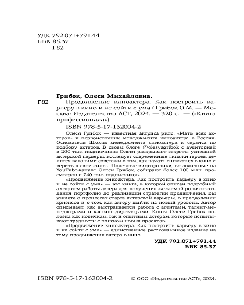 💳 Оплатить за товар можно при получении 🇰🇿 Есть бесплатная доставка по Казахстану от 1 дня 🎁 Копите бонусы с каждой покупки Серия: Книга профессионала Олеся Грибок — известная актриса рилс, «Мать всех актеров» и первоисточник менеджмента киноактера в России. Основатель Школы менеджмента киноактера и сервиса по подбору актеров. В своем блоге @olesyagribok с аудиторией в 200 тыс. подписчиков Олеся раскрывает секреты успешной актерской карьеры, исследует современные типажи героев, делится важными советами о том, как начать сниматься в кино и верить в свои силы. Полезные видеоролики, выложенные на YouTube-канале Олеси Грибок, собирают более 100 млн. просмотров и 740 тыс. подписчиков. |