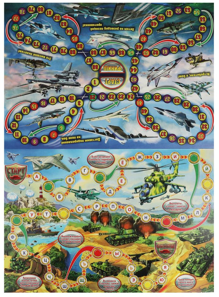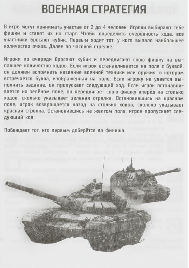 Игроки по очереди бросают кубик и передвигают свою фишку на выпавшее количество ходов. Если игрок останавливается на поле с буквой, он должен вспомнить название военной техники или оружия, в котором встречается буква, изображённая на поле. Если игроку не удаётся выполнить задание, он пропускает следующий ход. Если игрок останавливается на зелёном поле, он передвигает свою фишку вперёд на столько ходов, сколько указывает зелёная стрелка. Остановившись на красном поле, игрок возвращается назад на столько ходов, сколько указывает красная стрелка. Остановившись на жёлтом поле, игрок пропускает следующий ход.