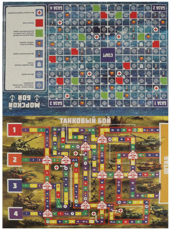 Правила игры «Танковый бой»: возьмите бумагу и карандаш. Каждый игрок рисует себе по 5 квадратиков-«танков». Цель — первым захватить штаб, имея хотя бы один целый танк. Игроки выбирают себе фишки и путь, по которому они будут двигаться. Фишки ставятся на старт. Игроки по очереди бросают кубик и передвигают свою фишку на выпавшее на нём количество очков. Если фишка остановилась на поле того же цвета, что и цвет поля, на котором стоит другой игрок (или сразу несколько), происходит бой! Эти игроки кидают по очереди кубик. У кого выпадет меньше очков, тот проиграл, его танк зачёркивается. Если ничья, игра продолжается без потерь. Такой же бой происходит, если фишки соперников встречаются на поле на пересечении путей.