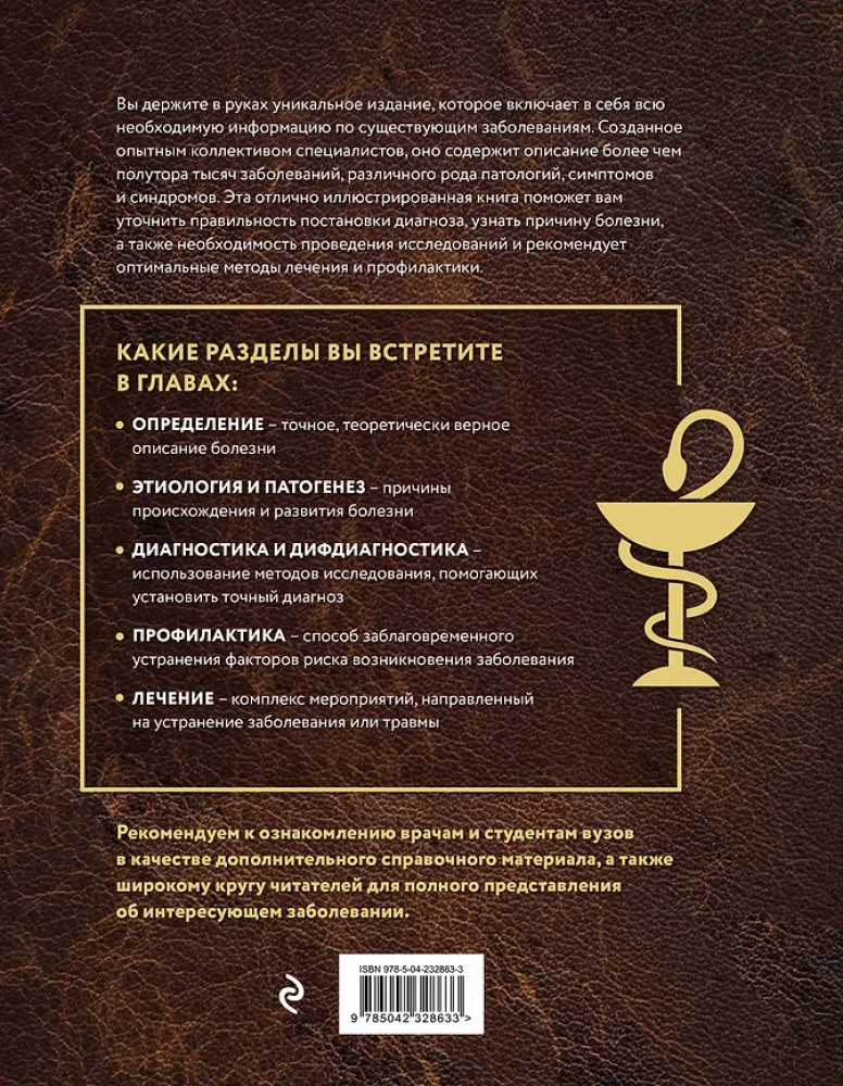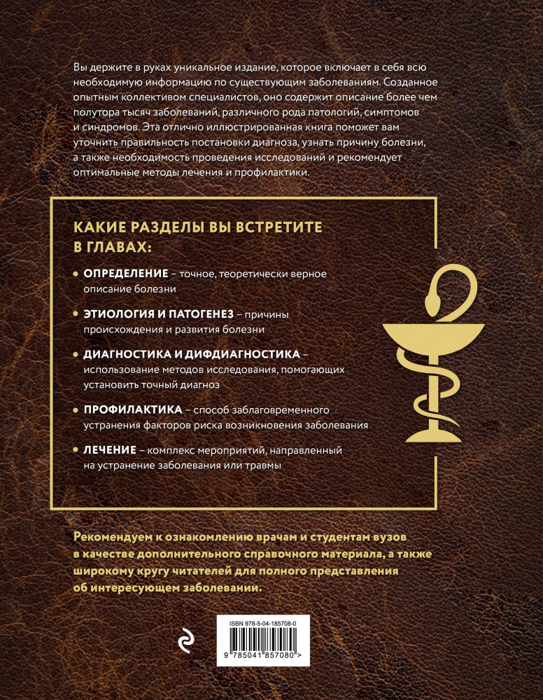 💳 Оплатить за товар можно при получении 🇰🇿 Есть бесплатная доставка по Казахстану от 1 дня 🎁 Копите бонусы с каждой покупки Серия: Полный медицинский справочник Данная книга является дополненным и актуализированным изданием Большой медицинской энциклопедии, проданной в количестве более 1 000 000 экземпляров. На страницах книги вы найдете подробную характеристику заболеваний с дополнительными иллюстрациями. Удобная постраничная навигация от А до Я поможет быстро сориентироваться в содержании, также в конце есть словник с определениями каждого медицинского термина. Незаменимая книга для всех, кто стремится пополнить свои знания и кто ценит свое здоровье. |