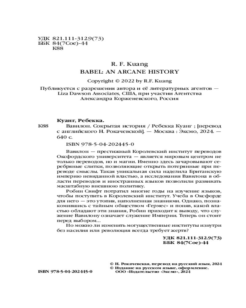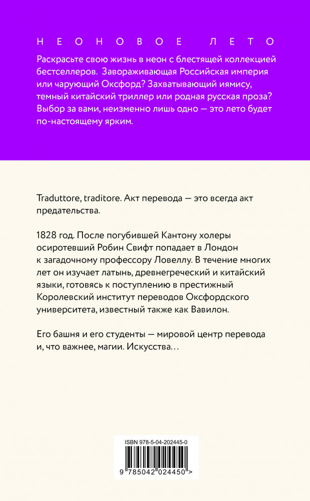 💳 Оплатить за товар можно при получении 🇰🇿 Есть бесплатная доставка по Казахстану от 1 дня 🎁 Копите бонусы с каждой покупки Серия: НЕОНОВОЕ ЛЕТО. Суперколлекция ТОП-9 Traduttore, traditore. Акт перевода — это всегда акт предательства. 1828 год. После погубившей Кантону холеры осиротевший Робин Свифт попадает в Лондон к загадочному профессору Ловеллу. В течение многих лет он изучает латынь, древнегреческий и китайские языки, готовясь к поступлению в престижный Королевский институт переводов Оксфордского университета, известный также как Вавилон. Его башня и его студенты — мировой центр перевода и, что важнее, магии. Искусства проявления потерянных при переводе смыслов, с помощью зачарованных серебряных слитков. Именно эта магия сделала Британскую империю непобедимой, а исследования Вавилона в области иностранных языков служат внешней политики Империи. |