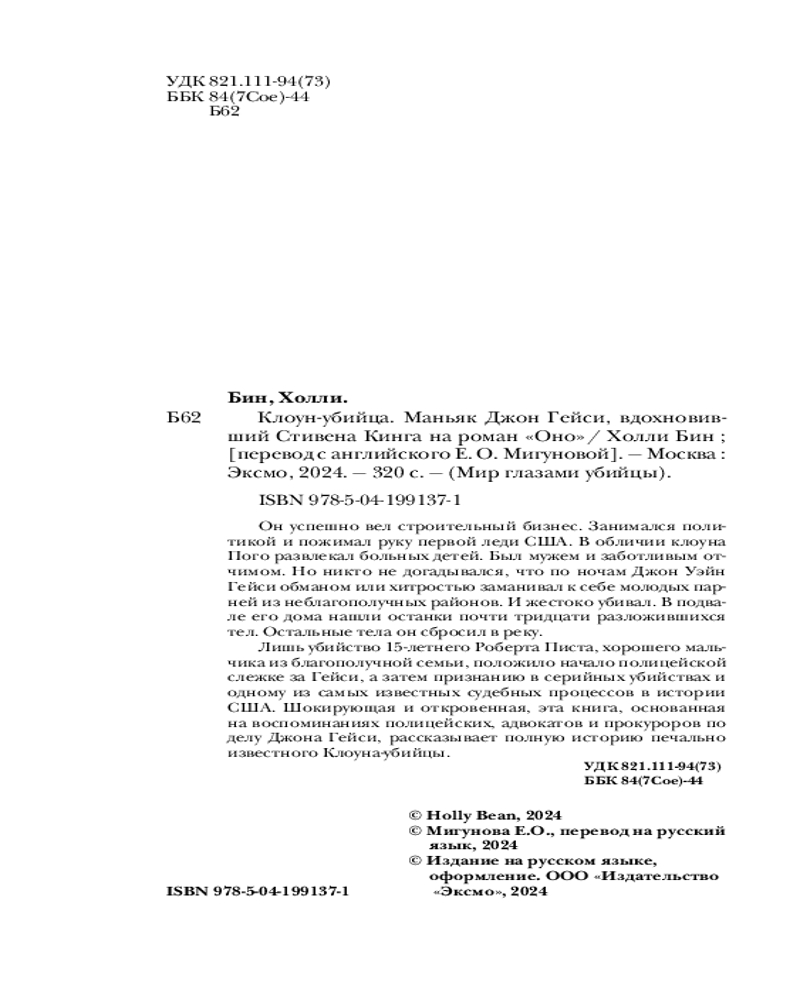 💳 Оплатить за товар можно при получении 🇰🇿 Есть бесплатная доставка по Казахстану от 1 дня 🎁 Копите бонусы с каждой покупки Серия: Мир глазами убийцы Он успешно вел строительный бизнес. Занимался политикой и пожимал руку первой леди США. В обличье клоуна Пого развлекал больных детей. Был мужем и заботливым отчимом. Но никто не догадывался, что по ночам Джон Уэйн Гейси выслеживал молодых парней из неблагополучных районов. И жестоко убивал. В подвале его дома нашли останки почти тридцати разложившихся тел. Остальные тела он сбросил в реку. |