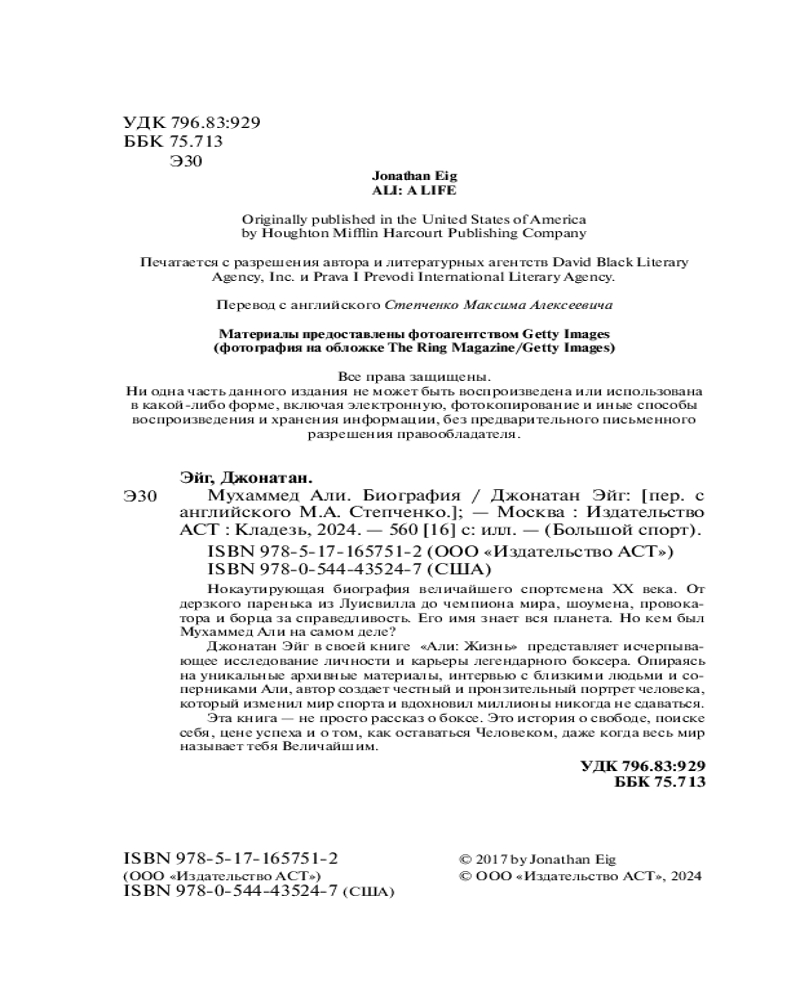 💳 Оплатить за товар можно при получении 🇰🇿 Есть бесплатная доставка по Казахстану от 1 дня 🎁 Копите бонусы с каждой покупки Серия: Большой спорт Нокаутирующая биография величайшего спортсмена XX века. От дерзкого паренька из Луисвилла до чемпиона мира, шоумена, провокатора и борца за справедливость. Его имя знает вся планета. Но кем был Мухаммед Али на самом деле? Исчерпывающее исследование личности и карьеры легендарного боксера. Опираясь на уникальные архивные материалы, интервью с близкими людьми и соперниками Али, автор создает честный и пронзительный портрет человека, который изменил мир спорта и вдохновил миллионы никогда не сдаваться. Эта книга — не просто рассказ о боксе. Это история о свободе, поиске себя, цене успеха и о том, как оставаться Человеком, даже когда весь мир называет тебя Величайшим. |