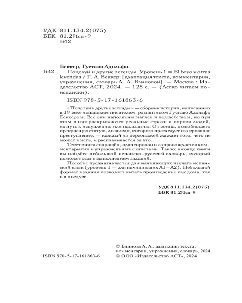 💳 Оплатить за товар можно при получении 🇰🇿 Есть бесплатная доставка по Казахстану от 1 дня 🎁 Копите бонусы с каждой покупки Серия: Легко читаем по-испански «Поцелуй и другие легенды» — сборник историй, написанных в 19 веке испанским писателем-романтиком Густаво Адольфо Беккером. Все они наполнены магией и волшебством, но при этом в них раскрываются реальные страхи и пороки людей, их путь к искуплению или наказанию. От воина, полюбившего прекрасную статую, до вождя, которого преследует его кровавое преступление, — каждый из персонажей жаждет того, чего не может иметь, и расплачивается за это. Текст книги сокращён, адаптирован и сопровождается комментариями и упражнениями с ответами. Также в конце книги вы найдёте небольшой испанско-русский словарь, который поможет вам с выполнением заданий. Пособие предназначается для начинающих изучать испанский язык (уровень 1 — для начинающих А1—А2). Небольшой формат издания позволяет читать произведение как дома, так и в поездке. |