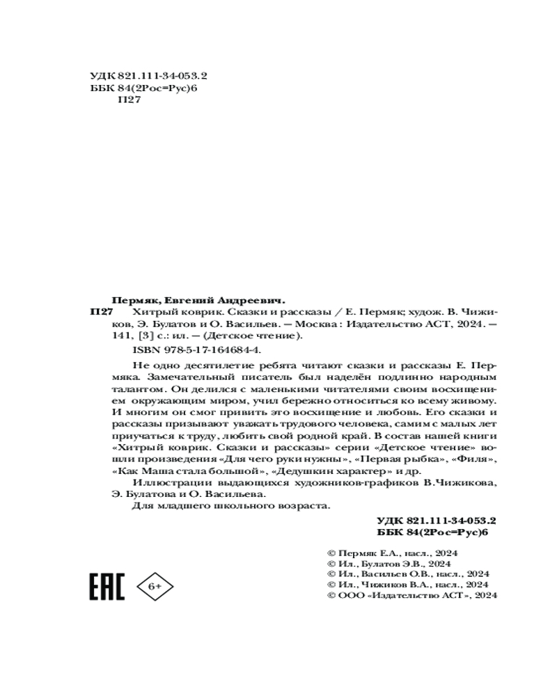 💳 Оплатить за товар можно при получении 🇰🇿 Есть бесплатная доставка по Казахстану от 1 дня 🎁 Копите бонусы с каждой покупки Серия: Детское чтение Не одно десятилетие ребята читают сказки и рассказы Е. Пермяка. Замечательный писатель был наделён подлинно народным талантом. Он делился с маленькими читателями своим восхищением окружающим миром, учил бережно относиться ко всему живому. И многим он смог привить это восхищение и любовь. Его сказки и рассказы призывают уважать трудового человека, самим с малых лет приучаться к труду, любить свой родной край. В состав нашей книги «Хитрый коврик. Сказки и рассказы» серии «Детское чтение» вошли произведения «Для чего руки нужны», «Первая рыбка», «Филя», «Как Маша стала большой», «Дедушкин характер» и др. Иллюстрации выдающихся художников-графиков В.Чижикова, Э. Булатова и О. Васильева. |