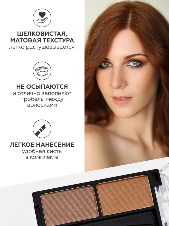 Компактные палетки из двух гармонирующих друг с другом оттенков, позволяют, смешивая их, подобрать более естественный цвет к волосам и добиться потрясающего натурального эффекта. В комплекте прилагается маленькая узкая кисточка, которая помогает легко распределить тени по бровям, прорисовать четкий изгиб и растушевывать.Тени легко набираются на кисть, хорошо ложатся, не осыпаются и отлично заполняют пробелы между волосками, не требуя особых навыков для нанесения.