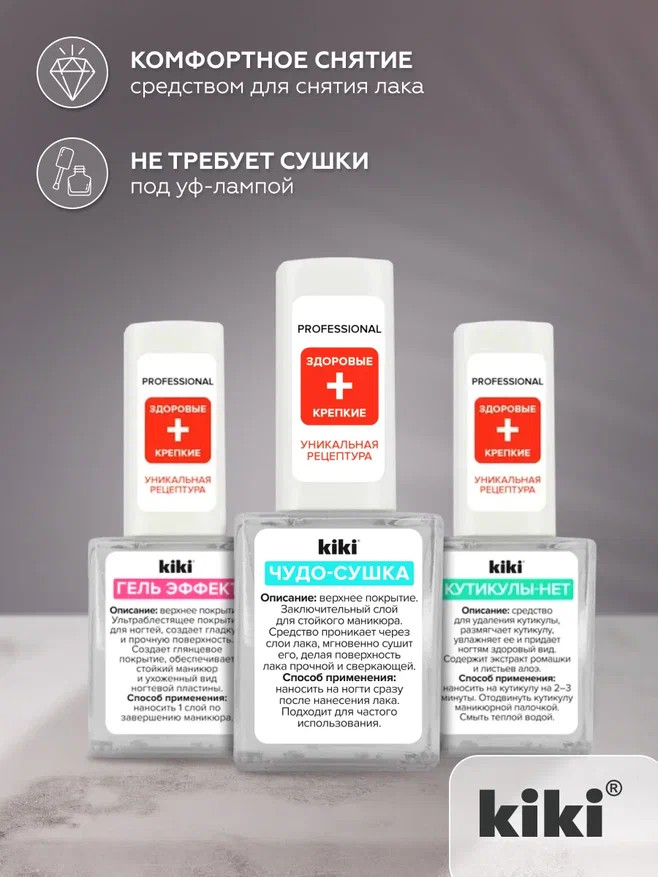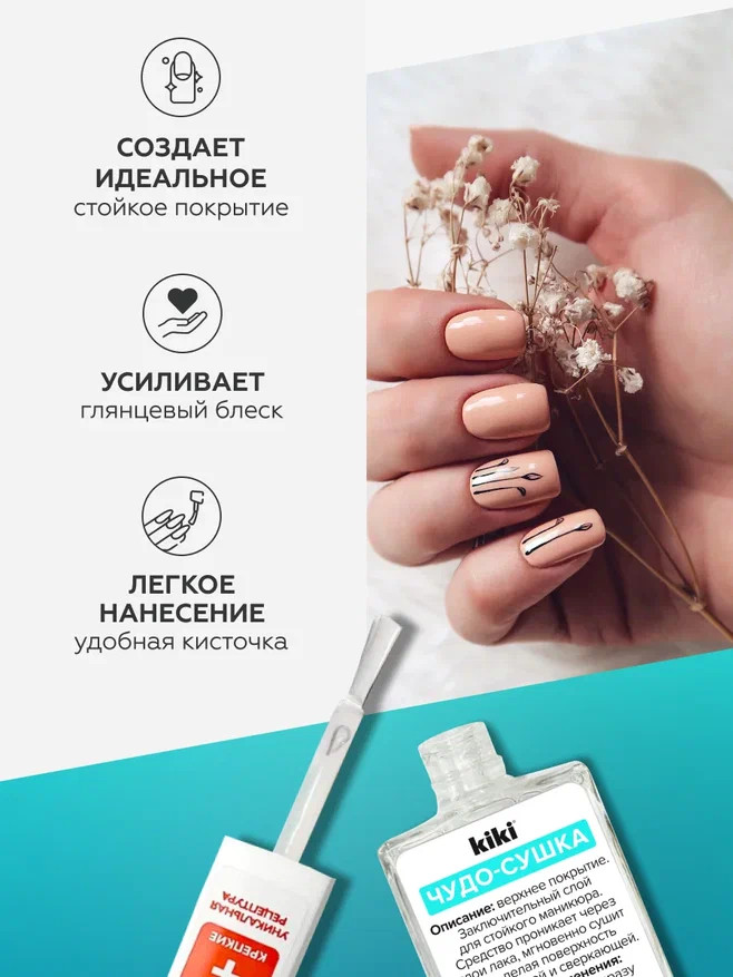 Kiki Покрытие для ногтей верхнее «Чудо-сушка»В данный момент этот товар отсутствует в продаже. Возможно, у нас найдется аналогичный или похожий товар здесь. Верхнее покрытие. Заключительный слой для стойкого маникюра. Средство проникает через слои лака, мгновенно сушит его, делая поверхность лака прочной и сверкающей. |