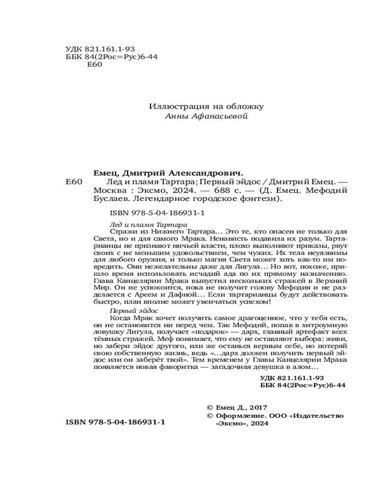 💳 Оплатить за товар можно при получении 🇰🇿 Есть бесплатная доставка по Казахстану от 1 дня 🎁 Копите бонусы с каждой покупки Серия: Д. Емец. Мефодий Буслаев. Легендарное городское фэнтези В седьмой книге, «Лёд и пламя Тартара», Мефодий противостоит ужасным всадникам Тартара, Дафна неожиданно становится обычным подростком, а валькирии-одиночке предстоит выбор между своими принципами и опасностью вновь оказаться в инвалидном кресле. Предстоит тяжёлая битва, вот только мрак, в лице Лигула, отнюдь не на стороне Мефодия Буслаева. В восьмой книге франшизы, «Первый эйдос», Мефодий получает «подарок» от Лигула — дарх тёмного стража, тем временем у главы канцелярии мрака на примете новая фаворитка — загадочная девушка в алом... |