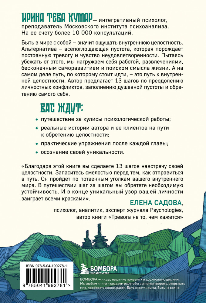 💳 Оплатить за товар можно при получении 🇰🇿 Есть бесплатная доставка по Казахстану от 1 дня 🎁 Копите бонусы с каждой покупки Серия: Психология по-русски Ирина Тева Кумар — интегративный психолог, преподаватель Московского института психоанализа. На ее счету более 10 000 консультаций. Целостность — это единство и гармоничное взаимодействие всех сторон личности. Когда она нарушается, мы чувствуем внутреннюю пустоту, тревогу и напряжение. Чтобы от них избавиться, мы пытаемся занять себя работой или развлечениями, бесконечным саморазвитием и поиском смысла жизни. Но единственный путь к целостности — принятие себя. Эта книга предлагает 13 последовательных шагов по преодолению внутренних конфликтов и заполнения душевной пустоты. |