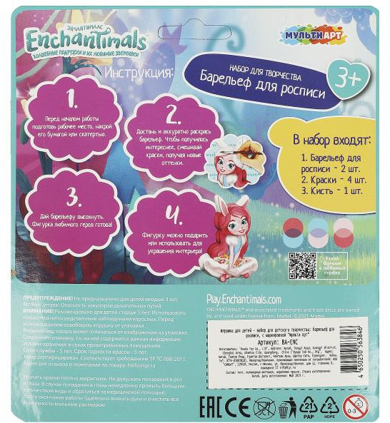 💳 Оплатить за товар можно при получении 🇰🇿 Есть бесплатная доставка по Казахстану от 1 дня 🎁 Копите бонусы с каждой покупки Серия: Enchantimals Набор для творчества — барельеф для росписи «Enchantimals. Бри Кроля и Твист» ТМ «Мульти Арт» непременно понравится маленьким поклонникам мультсериала про волшебных подружек и их питомцев. |