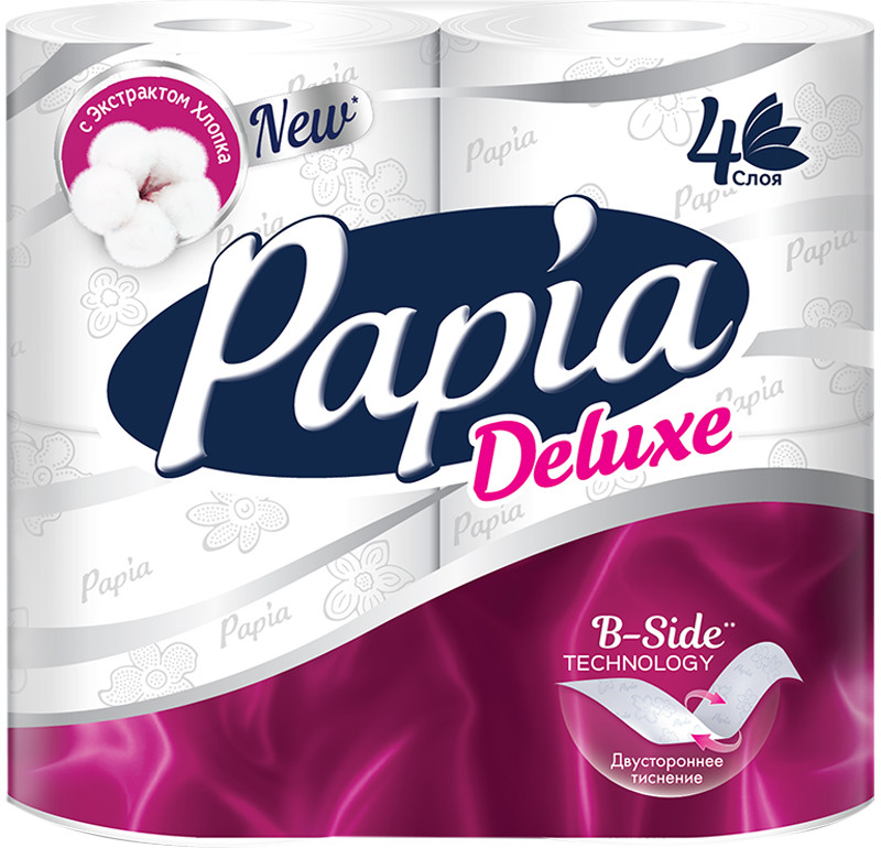 Белая четырехслойная бумага Papia с экстрактом хлопка необыкновенно мягкая и в то же время прочная. Уникальная технология двустороннего тиснения бумаги обеспечивает лучшую впитываемость и мягкость с обеих сторон. Очень мягкая, ослепительно белоснежная, прочная и впитывающая. Туалетная бумага Papia Deluxe (Делюкс) белая с тиснением и перфорацией. |