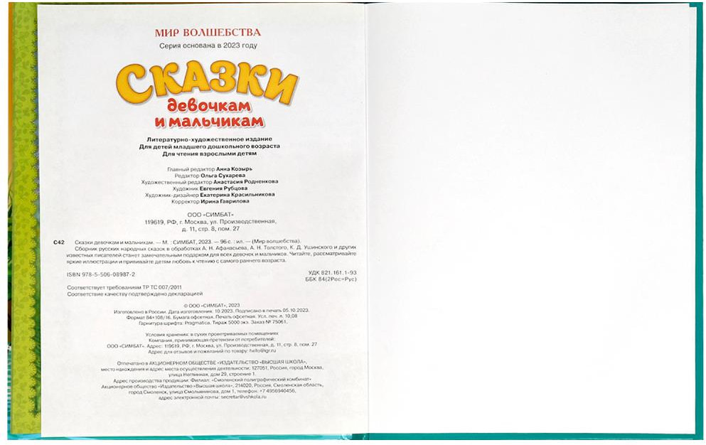 💳 Оплатить за товар можно при получении 🇰🇿 Есть бесплатная доставка по Казахстану от 1 дня 🎁 Копите бонусы с каждой покупки Книга «Сказки девочкам и мальчикам» из серии «Мир волшебства» ТМ «УМка» непременно порадует малышей. Сборник русских народных сказок в обработках А. Н. Афанасьева, А. Н. Толстого, К. Д. Ушинского и других известных писателей станет замечательным подарком для всех девочек и мальчиков. Ребёнок с удовольствием будет рассматривать красочные иллюстрации и приучаться к чтению с самого раннего возраста. |