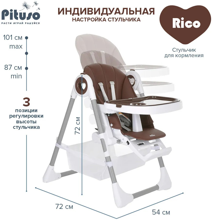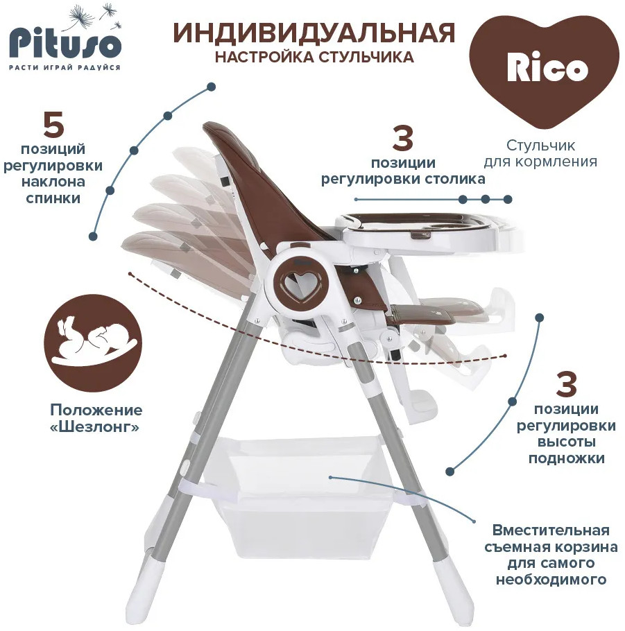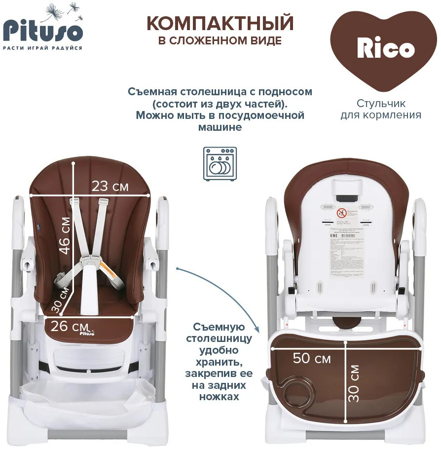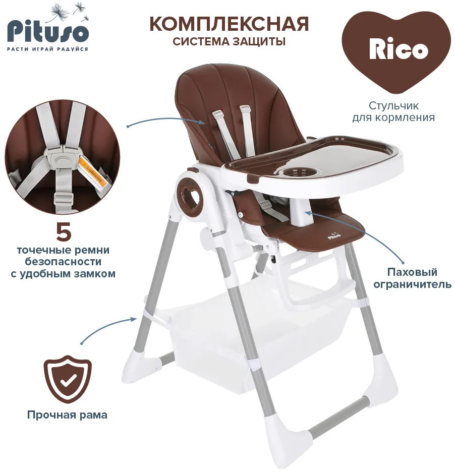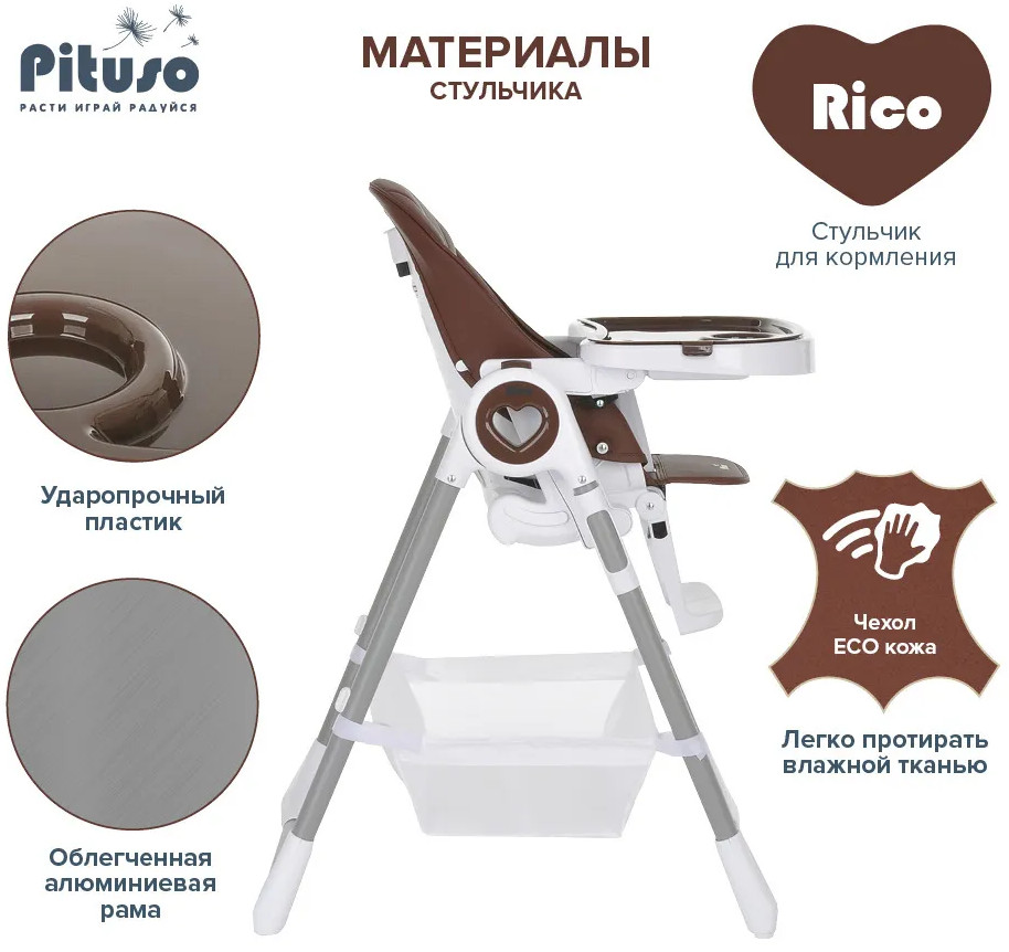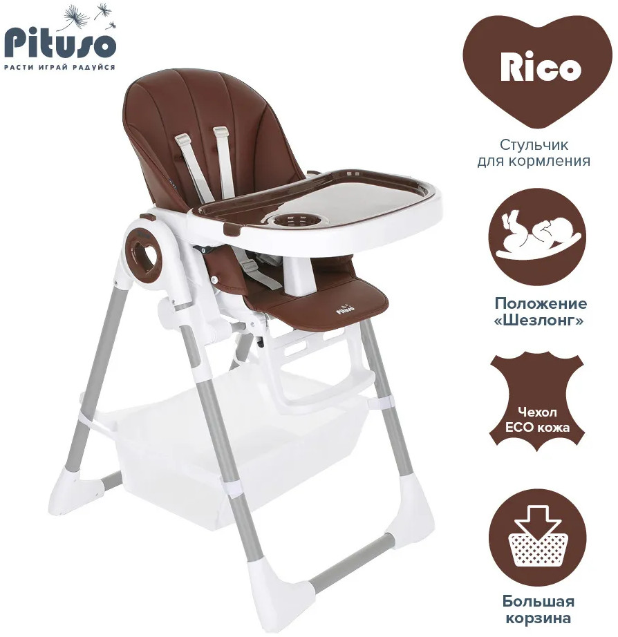 Детский стульчик для кормления Pituso Rico сочетает в себе стильный дизайн и удобство в использовании, делает уход за ребенком комфортным и безопасным. Стульчик обеспечивает правильное положение малыша во время принятия пищи. Удобно настраивается угол наклона, легко изменяется высота стульчика, чтобы было удобно и малышу, и его родителям. Стульчик прост в эксплуатации: легко передвигается, быстро складывается и раскладывается. Чехол выполнен из качественной экокожи. Столик состоит из двух частей, столешницу можно полностью снять и прикрепить сзади на специальные крючки на раме. Верхний поднос снимается, можно мыть в посудомоечной машине.