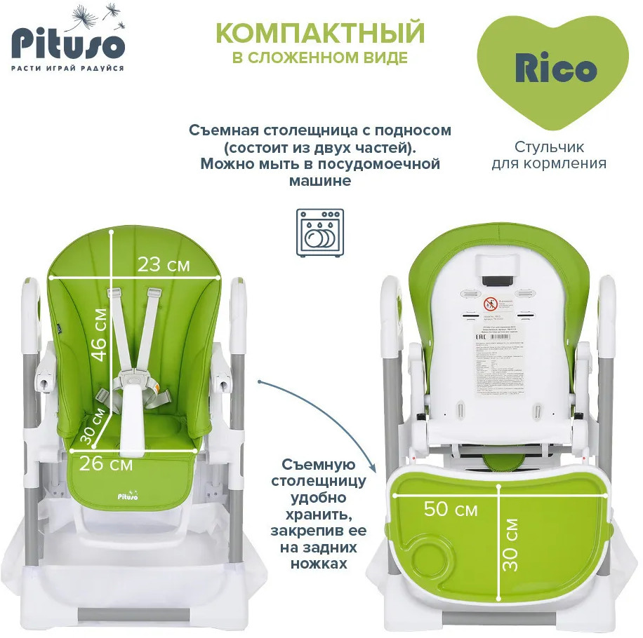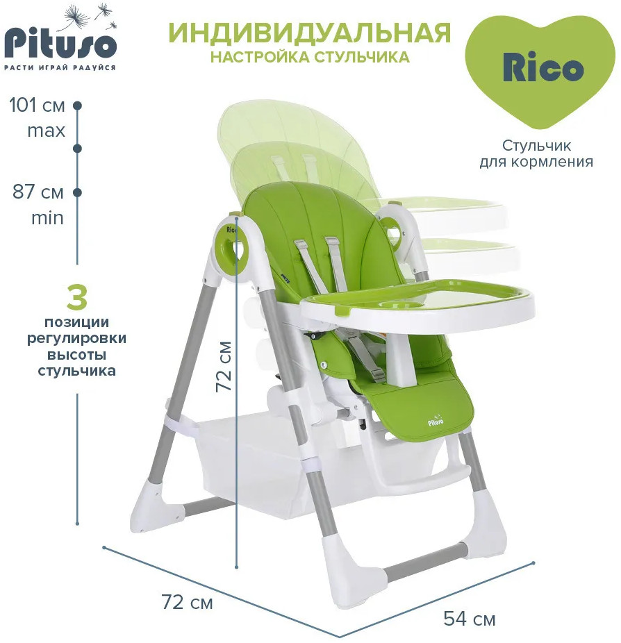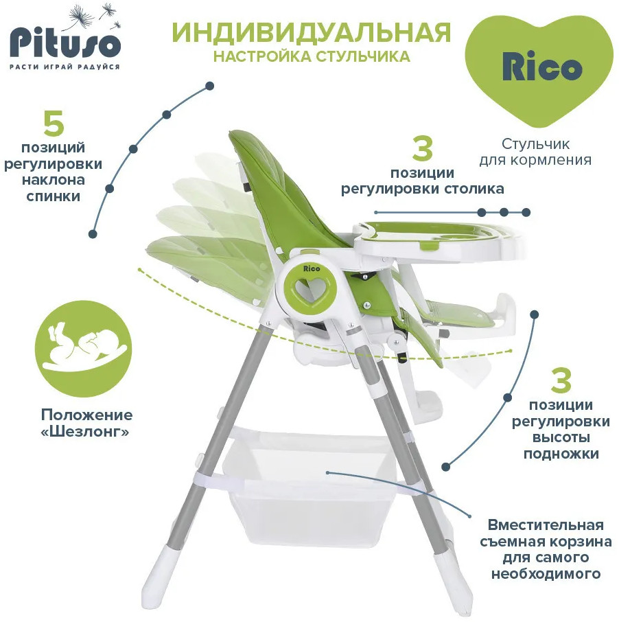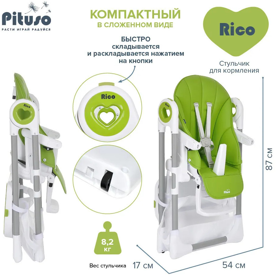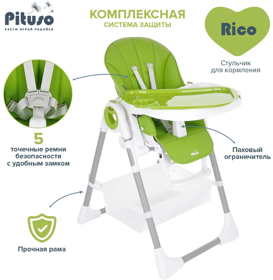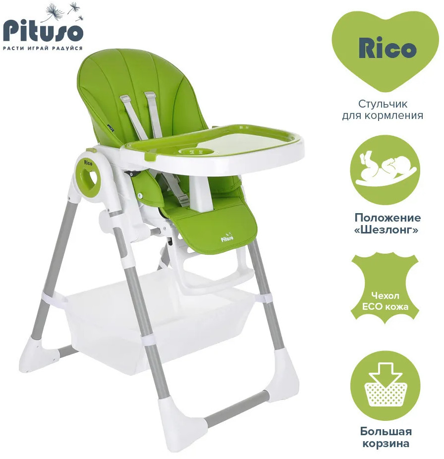 Детский стульчик для кормления Pituso Rico сочетает в себе стильный дизайн и удобство в использовании, делает уход за ребенком комфортным и безопасным. Стульчик обеспечивает правильное положение малыша во время принятия пищи. Удобно настраивается угол наклона, легко изменяется высота стульчика, чтобы было удобно и малышу, и его родителям. Стульчик прост в эксплуатации: легко передвигается, быстро складывается и раскладывается. Чехол выполнен из качественной экокожи. Столик состоит из двух частей, столешницу можно полностью снять и прикрепить сзади на специальные крючки на раме. Верхний поднос снимается, можно мыть в посудомоечной машине.