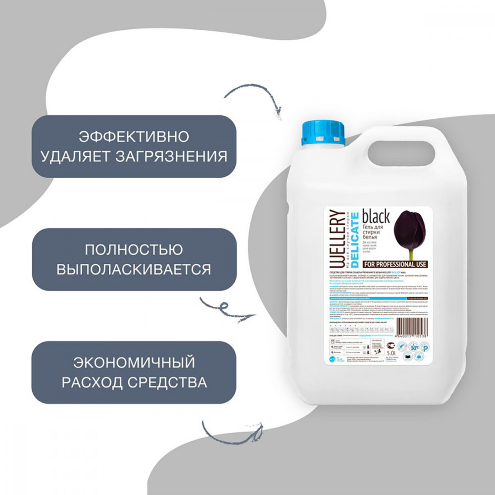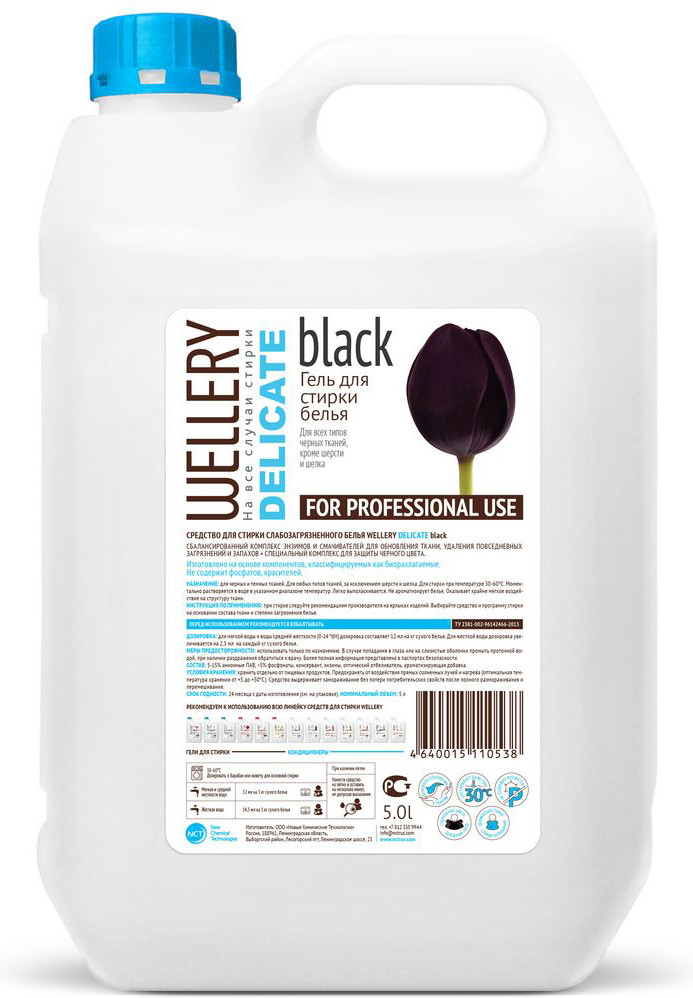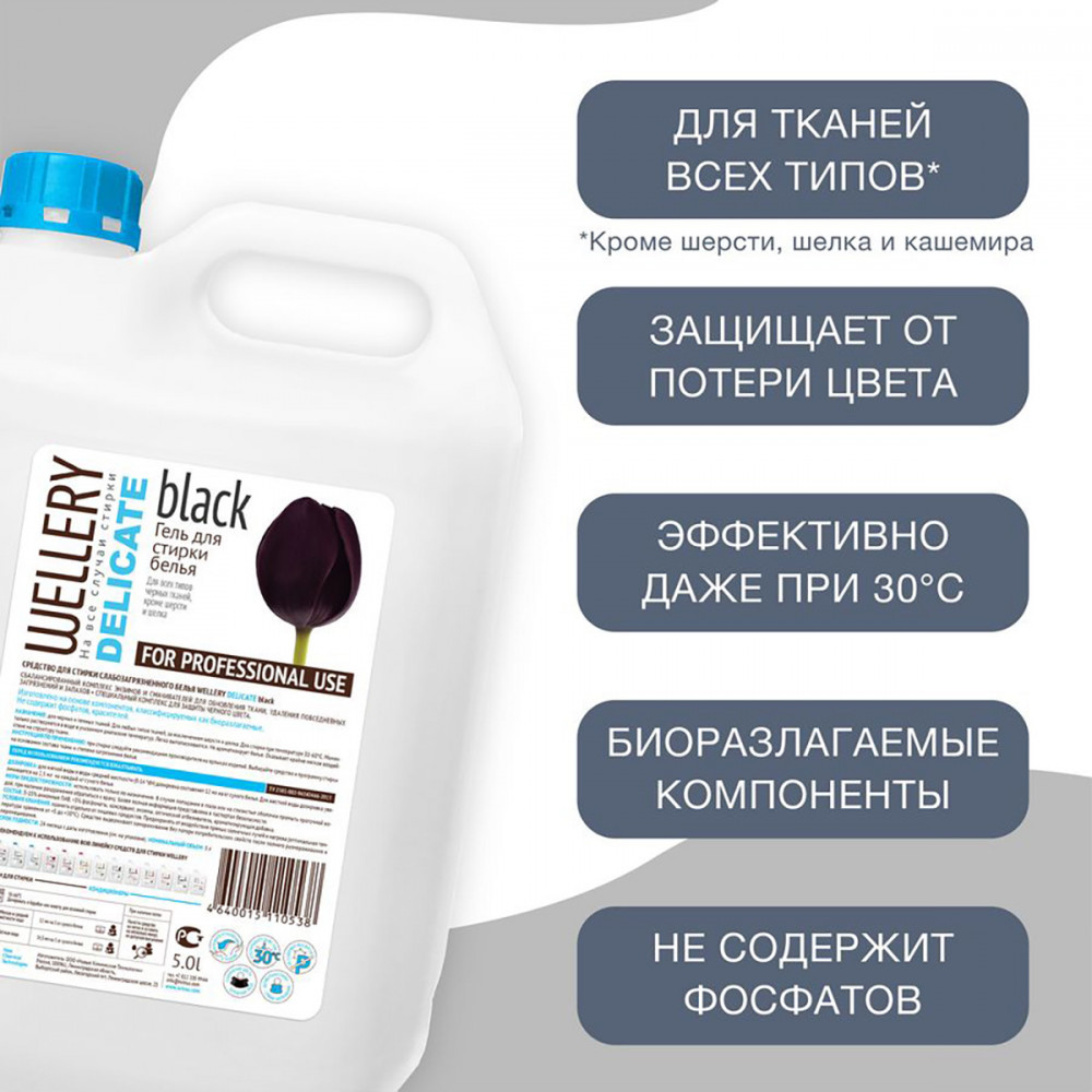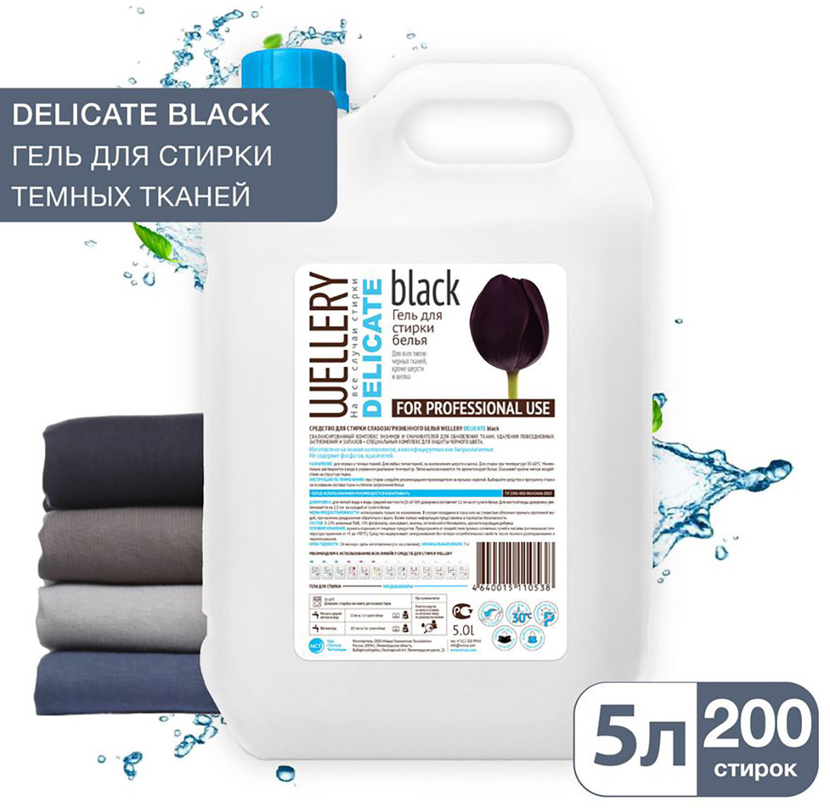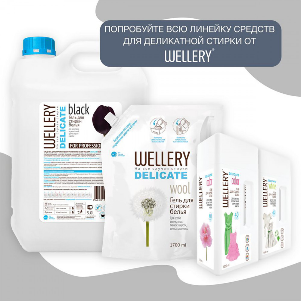 WELLERY DELICATE BLACK — гель для деликатной стирки чёрных и тёмных вещей из любых видов тканей, за исключением шерсти и шелка. Инновационная формула средства разработана в собственной лаборатории и не содержит жестких щелочных соединений. Гарантирует исключительно мягкое и бережное воздействие на ткань, что позволяет надолго сохранить красоту любимых вещей, возвращает насыщенность чёрным и тёмным тканям. Высокое качество средства для стирки вещей из темных и черных тканей и европейские ингредиенты помогают отстирывать загрязнения даже в прохладной воде, при этом защищает от потери цвета и возвращает яркость тканям. Гель для стирки полностью вымывается из ткани, изготовлен на основе биоразлагаемых компонентов, безопасен для окружающей среды, мягкий и не содержит фосфатов. Жидкий порошок подходит для автоматической и ручной стирки и ежедневного применения, не оставляет запаха на одежде.