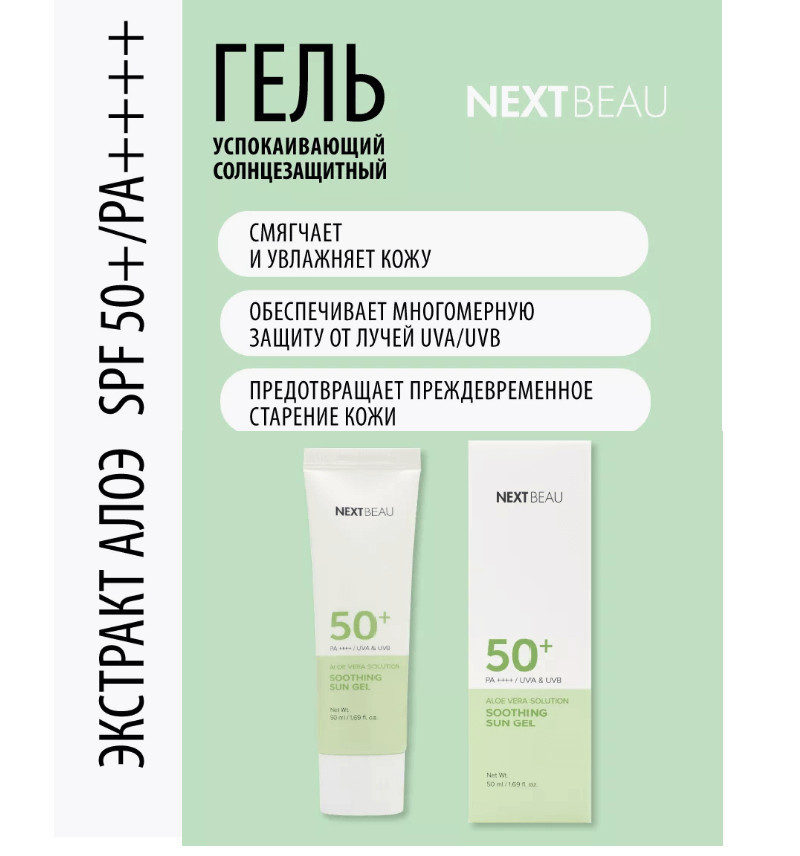 Nextbeau Гель солнцезащитный успокаивающий с экстрактом алоэ SPF 50+ PA++++ «Aloe Vera Solution Soothing Sun»В данный момент этот товар отсутствует в продаже. Возможно, у нас найдется аналогичный или похожий товар здесь. Солнцезащитный гель с экстрактом алоэ для кожи лица, шеи и декольте великолепно защищает кожу от вредного воздействия ультрафиолетовых лучей благодаря сочетанию химических и физических фильтров. Его нежная текстура окутывает кожу, словно воздушная вуаль, мгновенно создает ощущение комфорта и свежести. Не оставляет липкости и жирного блеска. Аллантоин и пантенол в составе геля быстро проникают в глубокие слои кожи, увлажняют ее изнутри и создают защитный барьер, предотвращающий потерю влаги. Экстракт алоэ вера успокаивает и смягчает кожу, способствует восстановлению ее защитных функций. Рекомендуется для чувствительной кожи. |