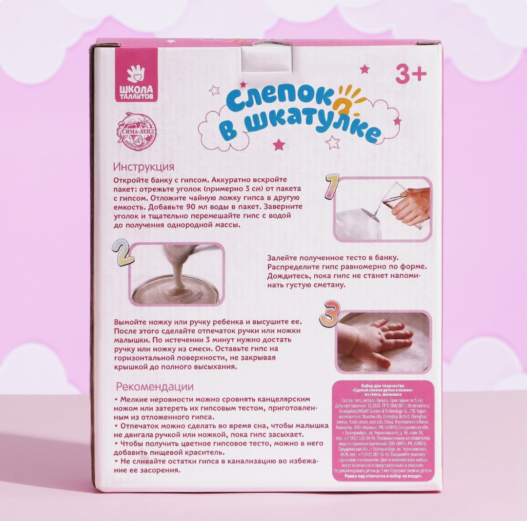 💳 Оплатить за товар можно при получении 🇰🇿 Есть бесплатная доставка по Казахстану от 1 дня 🎁 Копите бонусы с каждой покупки Инструкция по применению: необходимо смешать гипс с 90 мл воды. Тщательно перемешайте гипс с водой до получения однородной массы.Залейте полученное тесто в банку. Распределите гипс равномерно по форме. Дождитесь, пока гипс не станет напоминать густую сметану.Вымойте ножку или ручку ребенка и высушите ее. После этого сделайте отпечаток ручки или ножки малыша.По истечении 3 минут нужно достать ручку или ножку из смеси. Оставьте гипс на горизонтальной поверхности, не закрывая крышкой до полного высыхания. |
