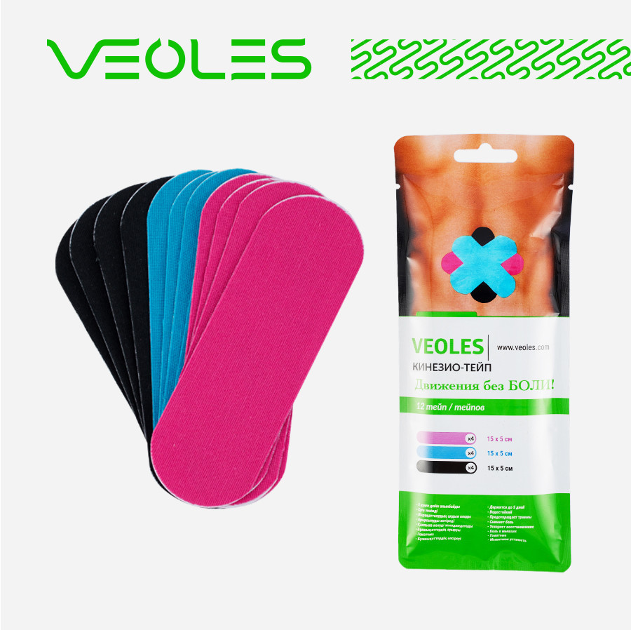 Кинезио-тейпы VEOLES — эластичные клейкие ленты, тянущиеся вдоль длины до 70% и не тянущиеся поперек. Это свойство позволяет широко использовать кинезио тейпы VEOLES в спортивной отрасли, в индустрии красоты и здоровья, прикладной медицине