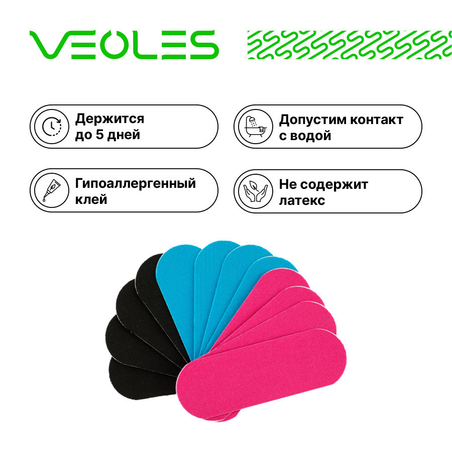 Кинезио-тейпы «Спина» в линейке VEOLES — аппликации готовые к употреблению, нарезанные, с закругленными концами, разных цветов, в индивидуальной упаковке:
