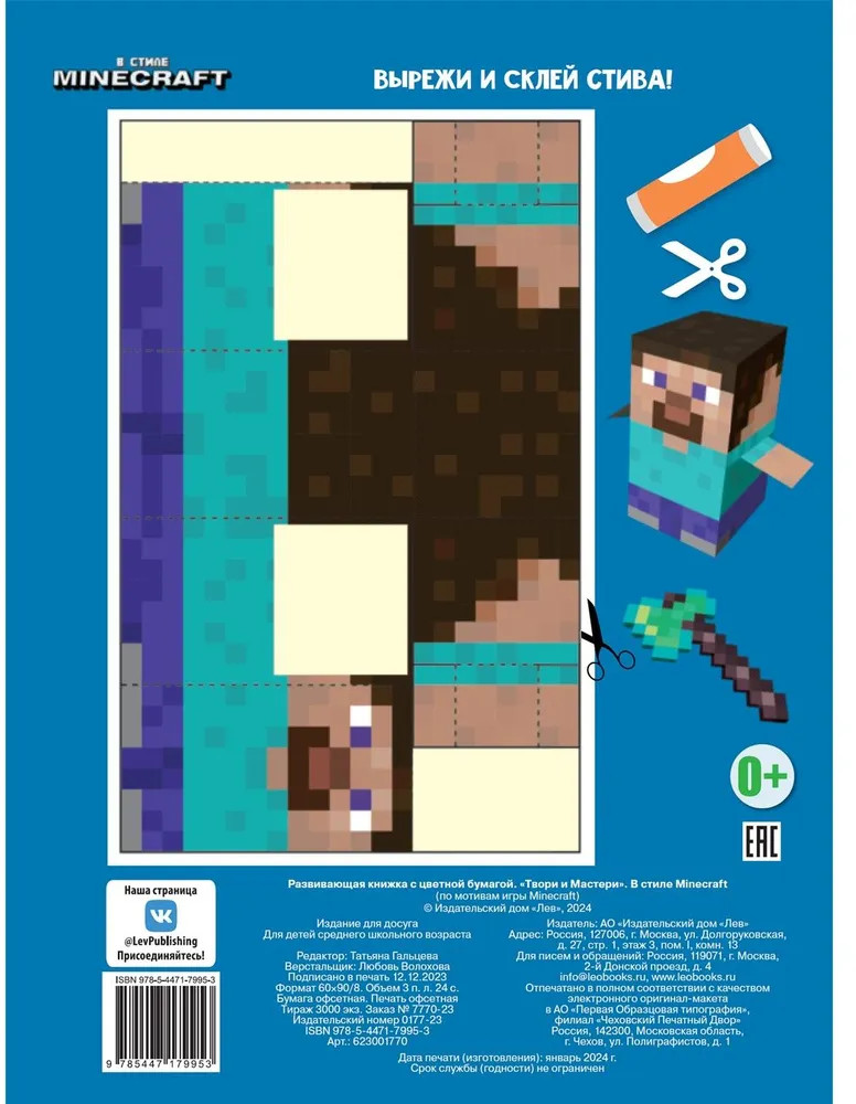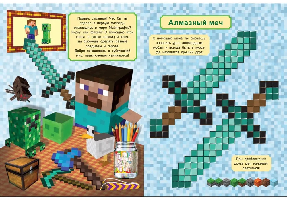 Minecraft. Развивающая книжка-вырезалка. Твори и мастериВ данный момент этот товар отсутствует в продаже. Возможно, у нас найдется аналогичный или похожий товар здесь. Привет, странник! Что бы ты сделал в первую очередь, оказавшись в мире Майнкрафта? Кирку или факел? С помощью этой книги, а также ножниц и клея, ты сможешь сделать разные предметы, мобов и героев. Добро пожаловать в кубический мир, приключения начинаются! Вырежи и склей: алмазный меч, сундук, фигурку паука, бумагу для фонаря или карандашницы, рамку для фотографии, закладку-косичку, фигурку волка, кирку, фигурку гуся, коробку-крипера, алмазный топор. |