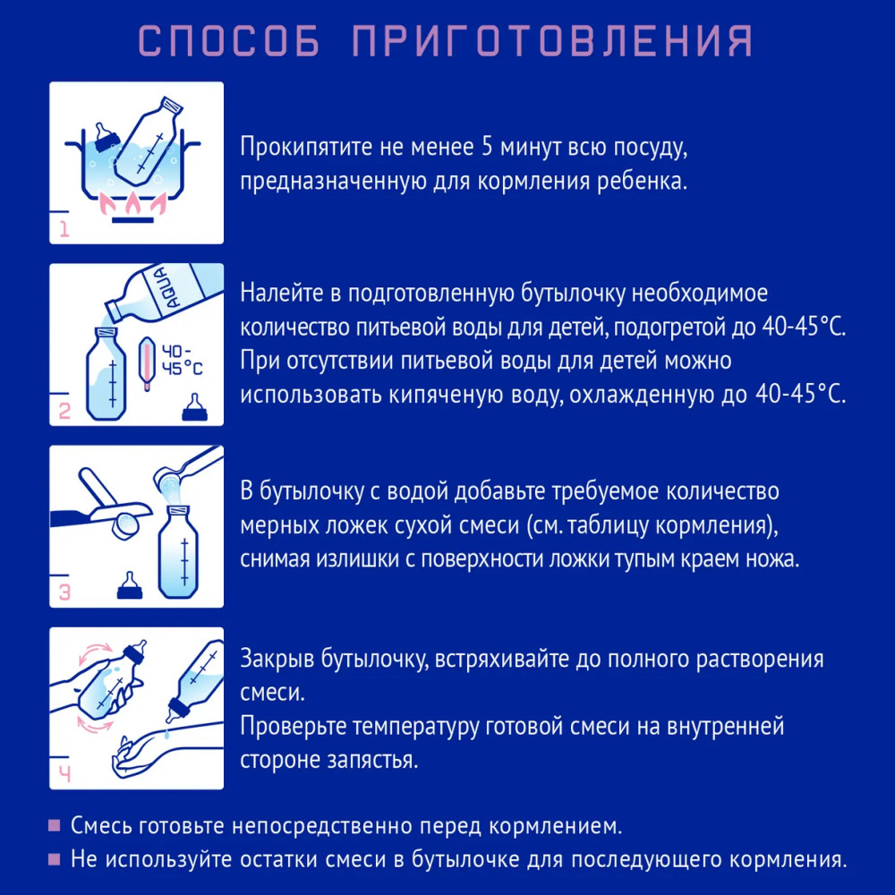 • не используйте остатки готовой смеси в бутылочке для последующего кормления;