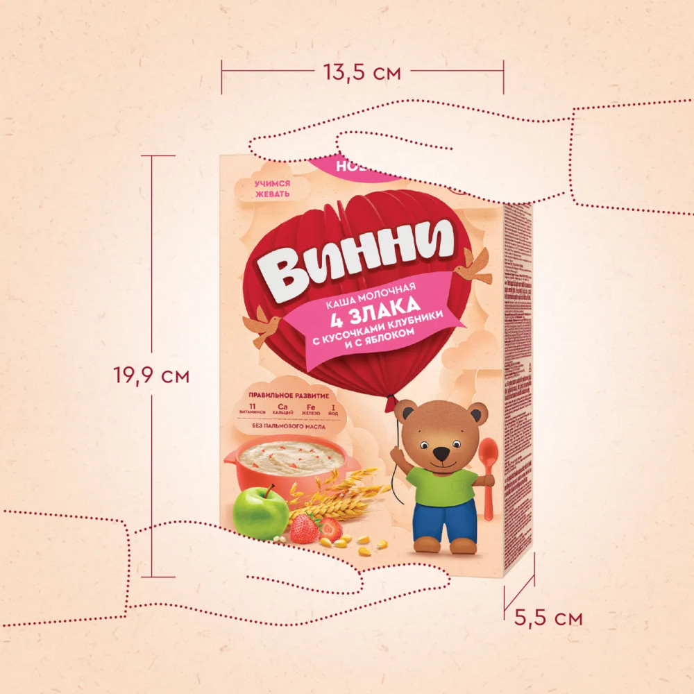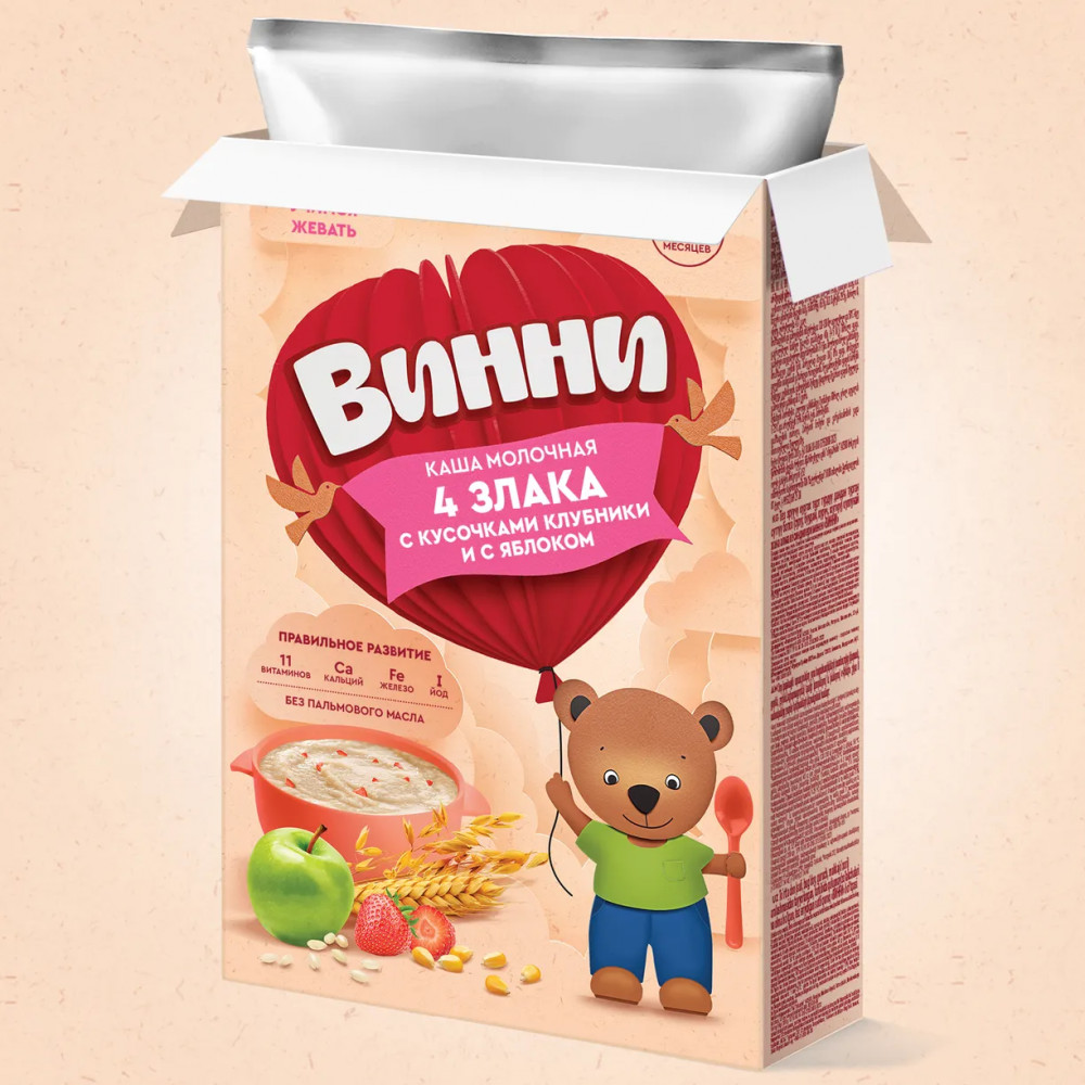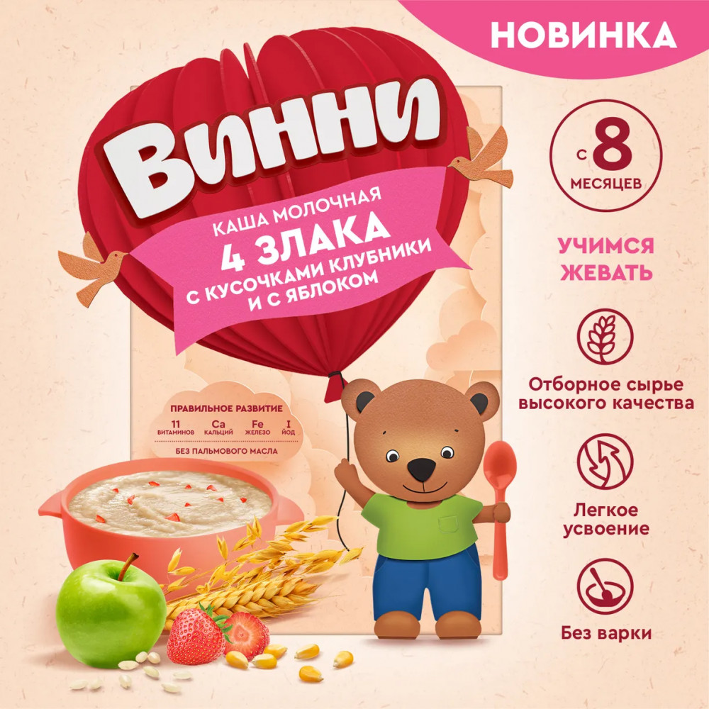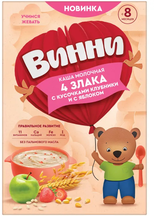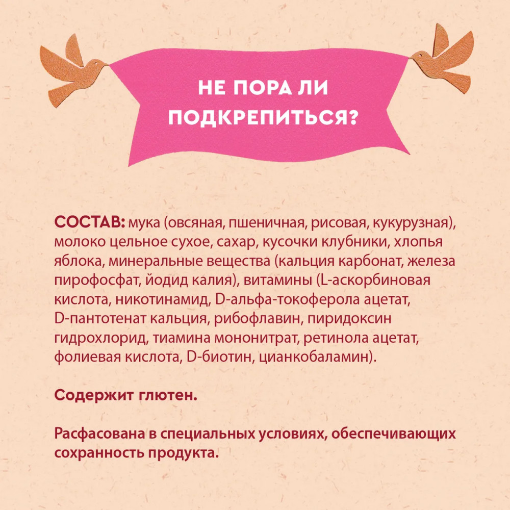 С кусочками клубники. Без пальмового масла. 4 полезных злака (овес, пшеница, рис, кукуруза) обеспечат подросшего малыша необходимыми питательными веществами. А кусочки клубники в сочетании с яблоком в каше помогут знакомству с новыми вкусами и в развитии навыков жевания у малыша.