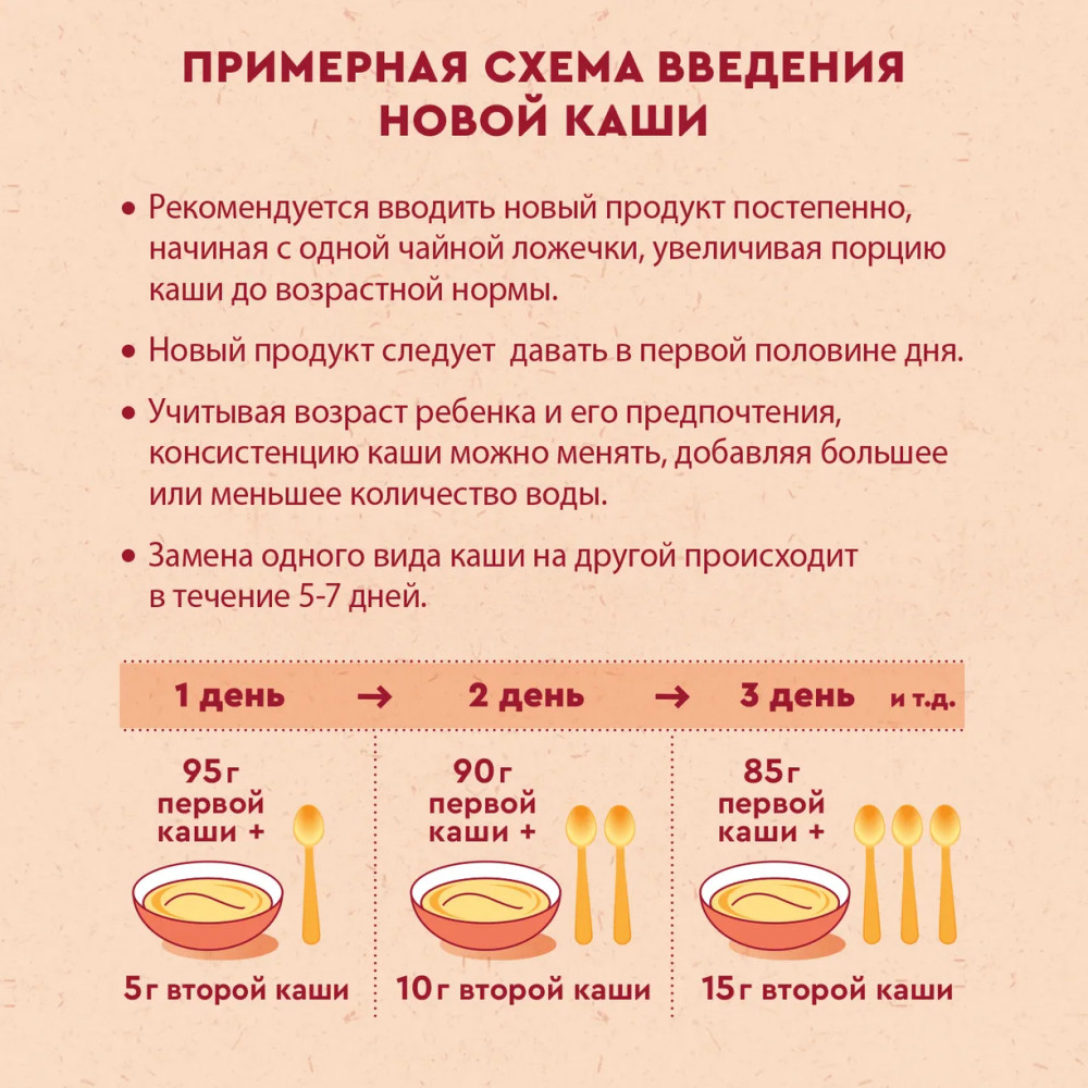 Учитывая возраст ребенка и его предпочтения, консистенцию каши можно изменить, добавляя или уменьшая количество воды. Перед введением нового продукта проконсультируйтесь с педиатром . Рекомендуется вводить новый продукт постепенно, начиная с одной ложечки, увеличивая порцию каши до возрастной нормы в течение 5–7 дней.