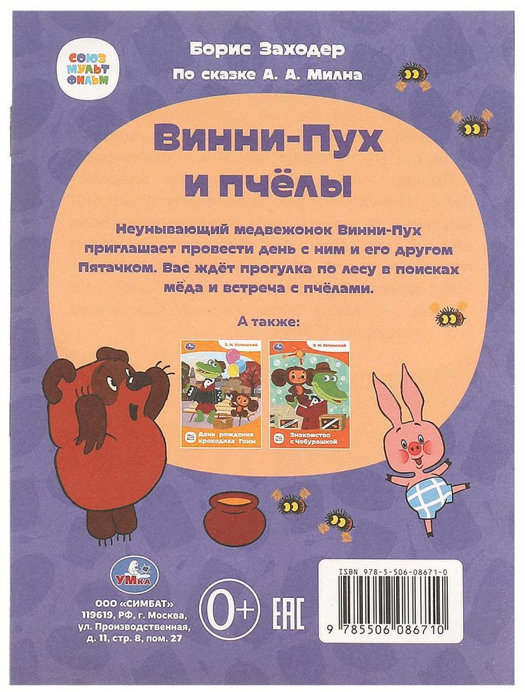 В данный момент этот товар отсутствует в продаже. Возможно, у нас найдется аналогичный или похожий товар здесь. Серия: Сказки и стихи малышам Книга-брошюра «Б. Заходер. Винни-Пух и пчёлы» из серии «Сказки и стихи малышам» ТМ «УМка» — отличный подарок для маленького поклонника известного м/ф студии «Союзмультфильм». Малыш с удовольствием будет слушать весёлую сказку про приключения неунывающего медвежонка Винни-Пуха и рассматривать красочные картинки, которые сделают процесс чтения ещё более увлекательным. Удобный формат позволит наслаждаться чтением не только дома, но и взять книгу на прогулку или в путешествие.