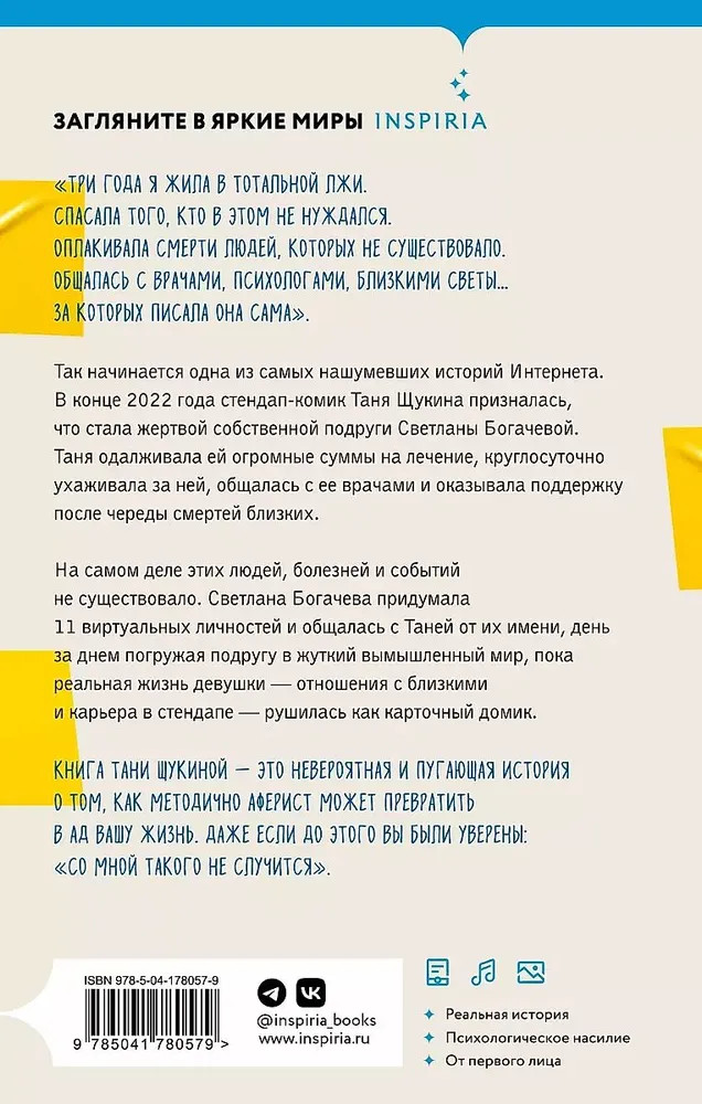 В данный момент этот товар отсутствует в продаже. Возможно, у нас найдется аналогичный или похожий товар здесь. Серия: Tok. Не говори никому. Про жуткие семейные тайны В конце 2022 года российский интернет взорвался от истории стендап-комика Тани Щукиной: девушка призналась, что стала жертвой своей подруги Светланы Богачевой. Таня одалживала ей огромные суммы на лечение рака и его осложнений, круглосуточно ухаживала за ней, общалась с ее врачами, друзьями и оказывала поддержку после смерти близких. На самом деле этих людей, болезней и событий не существовало: Светлана придумала 11 виртуальных личностей и общалась с Таней от их имени, день за днем погружая подругу в жуткий вымышленный мир, пока реальная жизнь Танина жизнь — отношения с близкими и карьера в стендапе, — рушилась как карточный домик. |