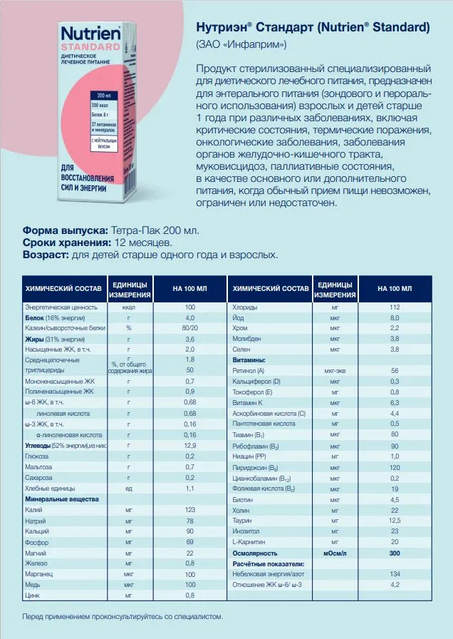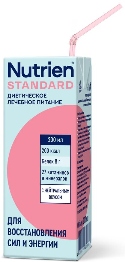 Nutrien Standard — полноценное специализированное питание для людей, нуждающихся в нутритивной поддержке, которым необходим дополнительный источник питательных веществ, содержит легкоусвояемый белок и энергию для сохранения веса и сил пациентов в период лечения и реабилитации. Состав полностью сбалансирован: в него входят витамины, питательные вещества и микроэлементы, которые нужны для нормального самочувствия и жизнедеятельности. Не содержит искусственные ароматизаторы и красители.
