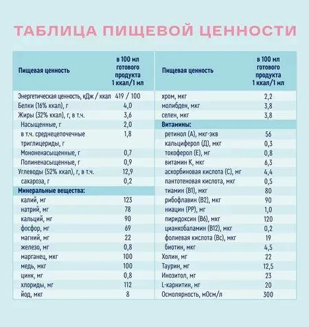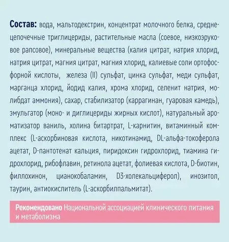 Вода, мальтодекстрин, концентрат молочного белка, среднецепочечные триглицериды, растительные масла (соевое, низкоэруковое рапсовое), минеральные вещества (хлорид магния, фосфат калия, цитрат калия, карбонат кальция, хлорид натрия, фосфат кальция, цитрат натрия, сульфат железа, сульфат цинка, сульфат меди, хлорид марганца, йодид калия, хлорид хрома, селенит натрия, молибдат аммония), сахар, ароматизатор, витамины (аскорбиновая кислота, никотинамид, токоферол ацетат, пантотенат кальция, пиридоксин гидрохлорид, тиамин гидрохлорид, рибофлавин, ретинол ацетат, фолиевая кислота, d-биотин, филлохинон, цианокобаламин, холекальциферол), холин битартрат, инозитол, L-карнитин, таурин, эмульгатор (лецитин), антиокислитель (аскорбилпальмитат).