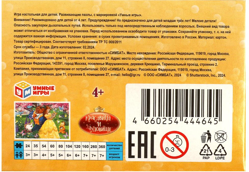 💳 Оплатить за товар можно при получении 🇰🇿 Есть бесплатная доставка по Казахстану от 1 дня 🎁 Копите бонусы с каждой покупки Классические пазлы в коробке «Красавица и Чудовище» ТМ «Умные игры» непременно понравятся маленьким любознайкам. Данный пазл представляет собой игру-головоломку, в которой необходимо в правильной последовательности соединить элементы друг с другом и получить в результате красочную картинку с изображением героев известной сказки. Сборка пазлов — это очень увлекательное занятие, в процессе которого дети учатся искать и совмещать детали разной формы, с каждым разом делая это всё лучше и быстрее. |