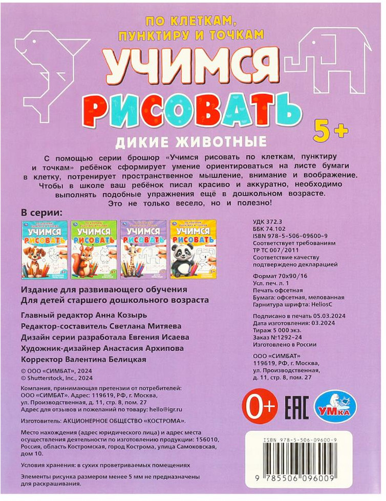 💳 Оплатить за товар можно при получении 🇰🇿 Есть бесплатная доставка по Казахстану от 1 дня 🎁 Копите бонусы с каждой покупки Серия: Учимся рисовать по клеткам, пунктиру и точкам Раскраска «Дикие животные» из серии «Учимся рисовать по клеткам, пунктиру и точкам» ТМ «УМка» - отличный развивающий тренажёр для мелкой моторики ребёнка. С помощью серии брошюр из данной серии ребёнок сформирует умения ориентироваться на листе бумаге в клетку. Чтобы в школе он смог писать красиво и аккуратно, необходимо выполнять подобные упражнения ещё в дошкольном возрасте. Это не только весело, но и полезно. Благодаря компактному формату раскраску удобно брать с собой в дорогу. |