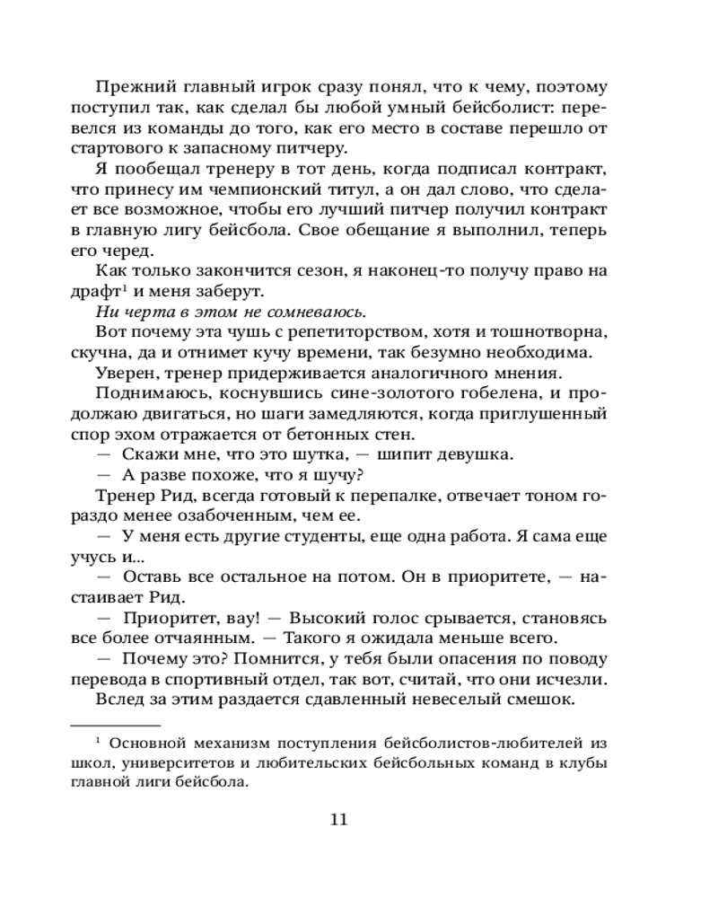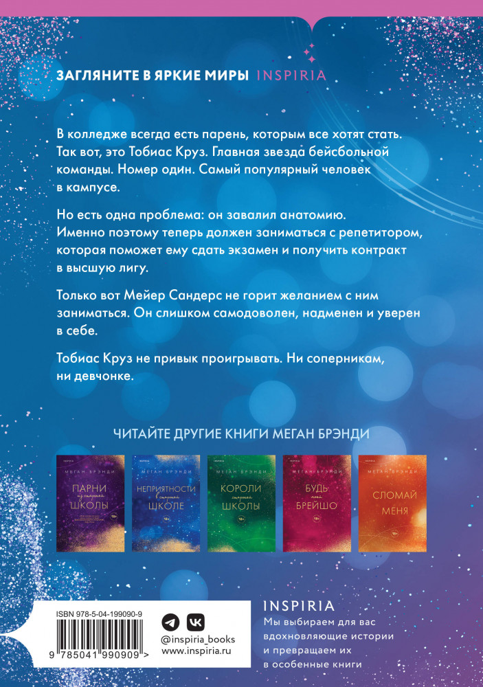 💳 Оплатить за товар можно при получении 🇰🇿 Есть бесплатная доставка по Казахстану от 1 дня 🎁 Копите бонусы с каждой покупки Серия: Pink Room. Элитные парни Меган Брэнди В колледже всегда есть парень, которым все хотят стать. Так вот, это Тобиас Круз. Главная звезда бейсбольной команды. Номер один. Самый популярный человек в кампусе. Но есть одна проблема: он завалил анатомию. Именно поэтому теперь должен заниматься с репетитором, которая поможет ему сдать экзамен и получить контракт в высшую лигу. Только вот Мейер Сандерс не горит желанием с ним заниматься. Он слишком самодоволен, надменен и уверен в себе. Тобиас Круз не привык проигрывать. Ни соперникам, ни девчонке. |