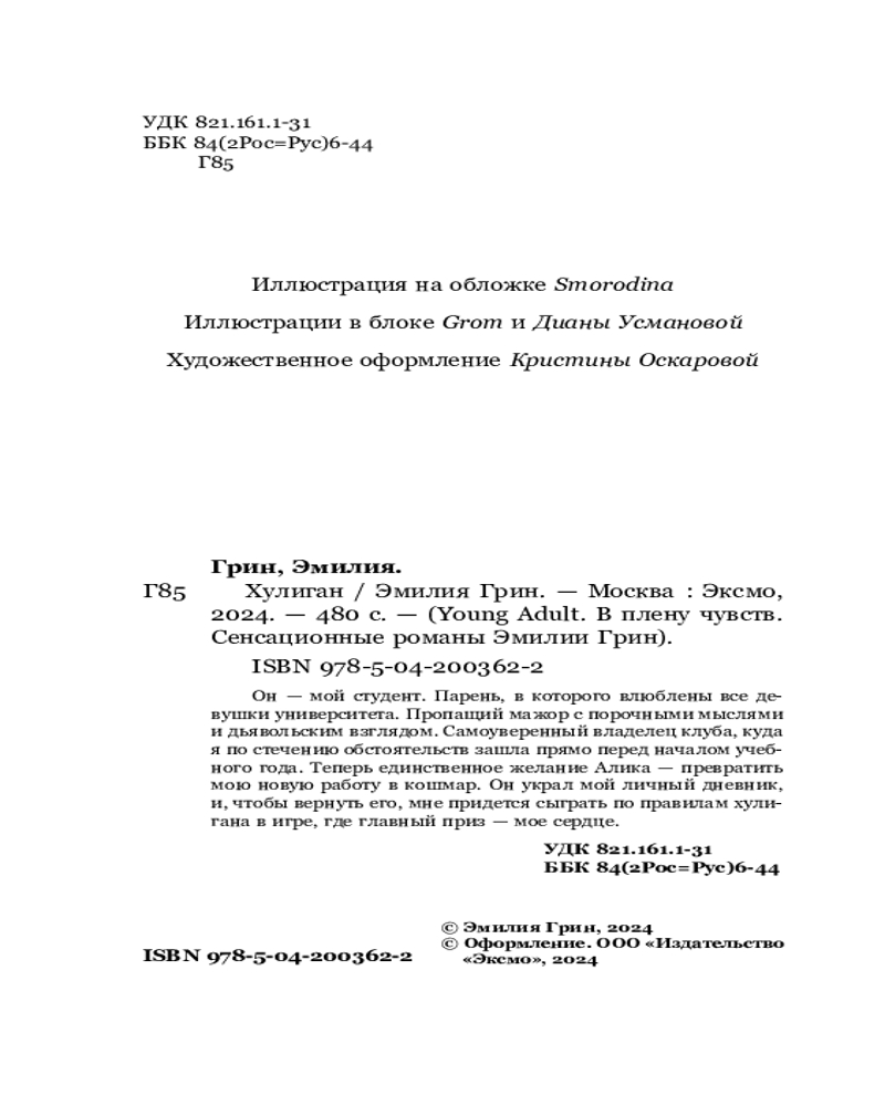 💳 Оплатить за товар можно при получении 🇰🇿 Есть бесплатная доставка по Казахстану от 1 дня 🎁 Копите бонусы с каждой покупки Серия: Young Adult. В плену чувств. Сенсационные романы Эмилии Грин Новинка Эмилии Грин о любви преподавательницы и студента. Трогательный и страстный роман для всех, кому по душе троп «от ненависти до любви» в декорациях университета, а также тех, кому нравится творчество Ники Сью и Лены Сокол! Он — мой студент. Парень, в которого влюблены все девушки университета. Пропащий мажор с порочными мыслями и дьявольским взглядом. Самоуверенный владелец клуба, куда я по стечению обстоятельств зашла прямо перед началом учебного года. Теперь единственное желание Алика — превратить мою новую работу в кошмар. Он украл мой личный дневник, и, чтобы вернуть его, мне придется сыграть по правилам хулигана в игре, где главный приз — мое сердце. |