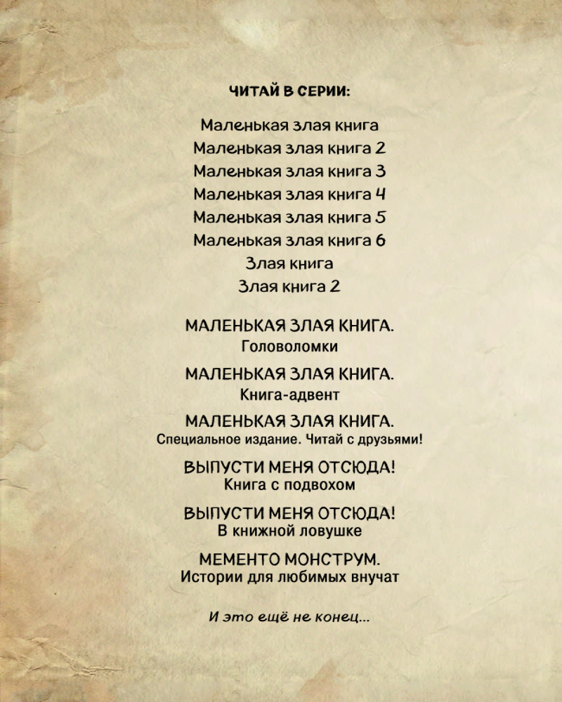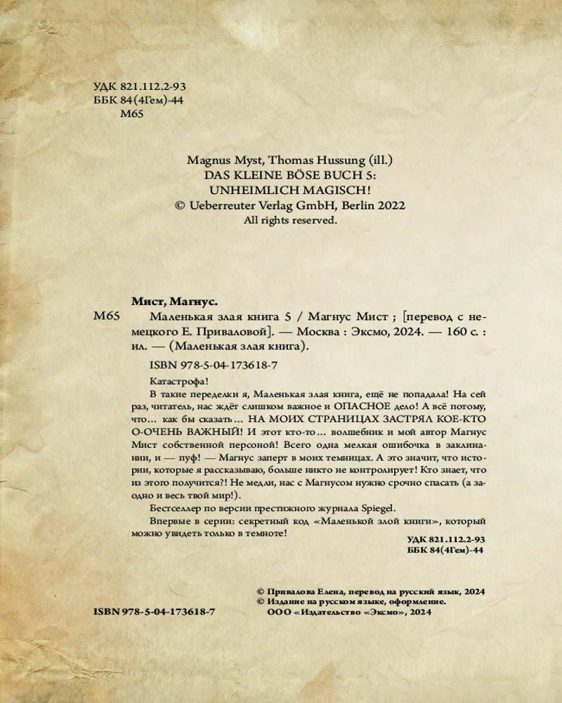 💳 Оплатить за товар можно при получении 🇰🇿 Есть бесплатная доставка по Казахстану 🎁 Копите бонусы с каждой покупки Серия: Детская. Маленькая злая книга «Маленькая злая книга» снова с тобой! И ей срочно нужна помощь читателей! Обещаем, что если в тебе нет ни капли магии, с тобой ничего не случится. Но если ты чувствуешь дремлющие волшебные силы, то это будет самое опасн... Нет, самое весёлое приключение в твоей жизни! (Только потом не говори, что мы тебя не предупреждали!) Как насчёт того, чтобы побывать в лаборатории писателя, одолеть тролльчиху, найти воздушный замок и заколдовать дракона? Тогда всех смельчаков мы приглашаем открыть первую страницу «Маленькой злой книги»! |