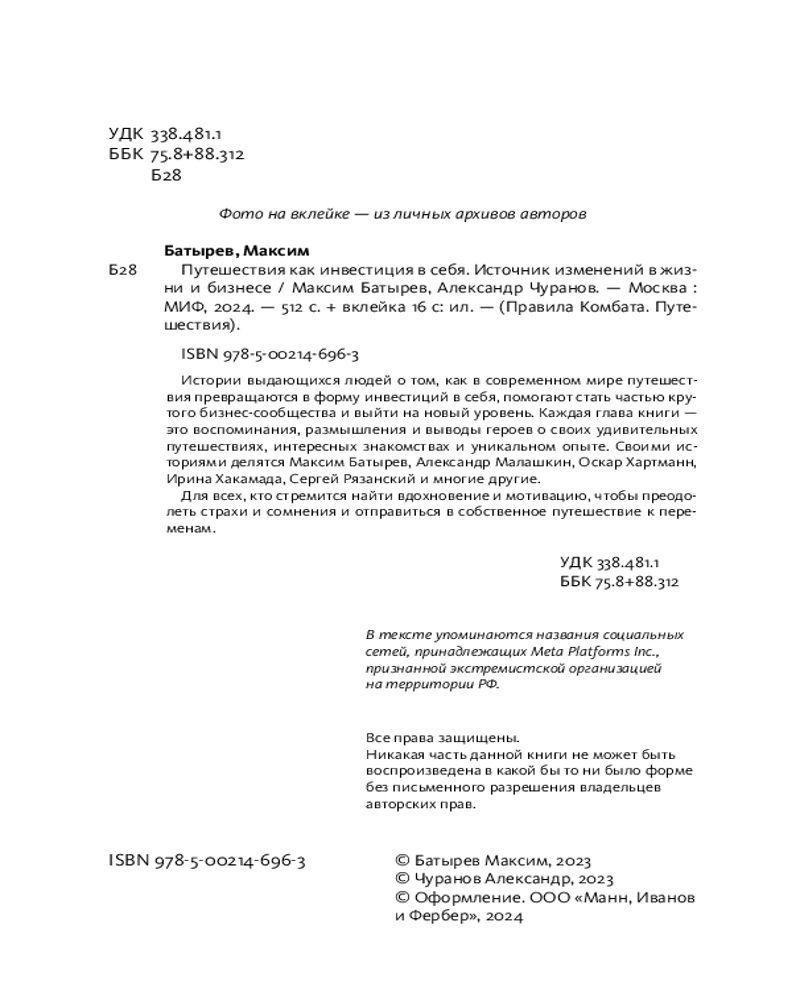 💳 Оплатить за товар можно при получении 🇰🇿 Есть бесплатная доставка по Казахстану от 1 дня 🎁 Копите бонусы с каждой покупки Серия: Правила Комбата. Путешествия Истории выдающихся людей о том, как в современном мире путешествия превращаются в форму инвестиций в себя, помогают стать частью бизнес-сообщества и выйти на новый уровень. Каждая глава книги — это воспоминания, размышления и выводы героев о своих удивительных путешествиях, интересных знакомствах и уникальном опыте. Своими историями делятся Максим Батырев, Александр Малашкин, Оскар Хартманн, Ирина Хакамада, Сергей Рязанский и многие другие. |