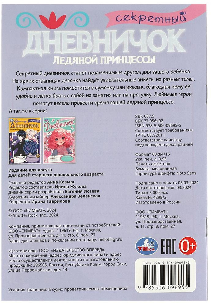 💳 Оплатить за товар можно при получении 🇰🇿 Есть бесплатная доставка по Казахстану от 1 дня 🎁 Копите бонусы с каждой покупки Секретный дневничок ледяной принцессы ТМ «УМка» станет отличным подарком для юной леди. Секретный дневничок станет лучшим другом для девочки. На ярких страницах она найдёт увлекательные анкеты на разные темы. Небольшая книга поместиться в сумочку или рюкзак, благодаря чему её удобно и легко брать с собой на занятия или на прогулку. Дневничок поможет интересно провести время и лучше узнать себя. |