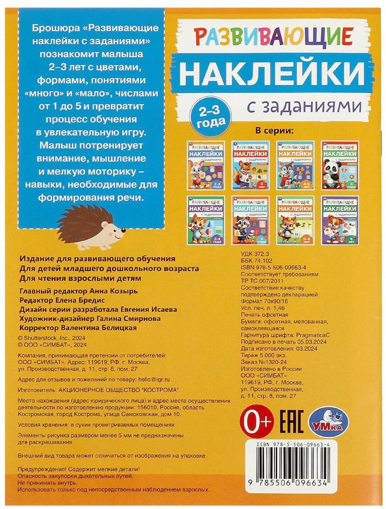 💳 Оплатить за товар можно при получении 🇰🇿 Есть бесплатная доставка по Казахстану от 1 дня 🎁 Копите бонусы с каждой покупки Брошюра «Развивающие наклейки с заданиями» ТМ «УМка» непременно понравится маленьким любознайкам. Данная брошюра познакомит малыша 2 - 3 лет с цветами, формами, понятиями «много» и «мало», числами от 1 до 5 и превратит процесс обучения в увлекательную игру. Ребёнок потренирует внимание, мышление и мелкую моторику - навыки, необходимые для формирования речи. |