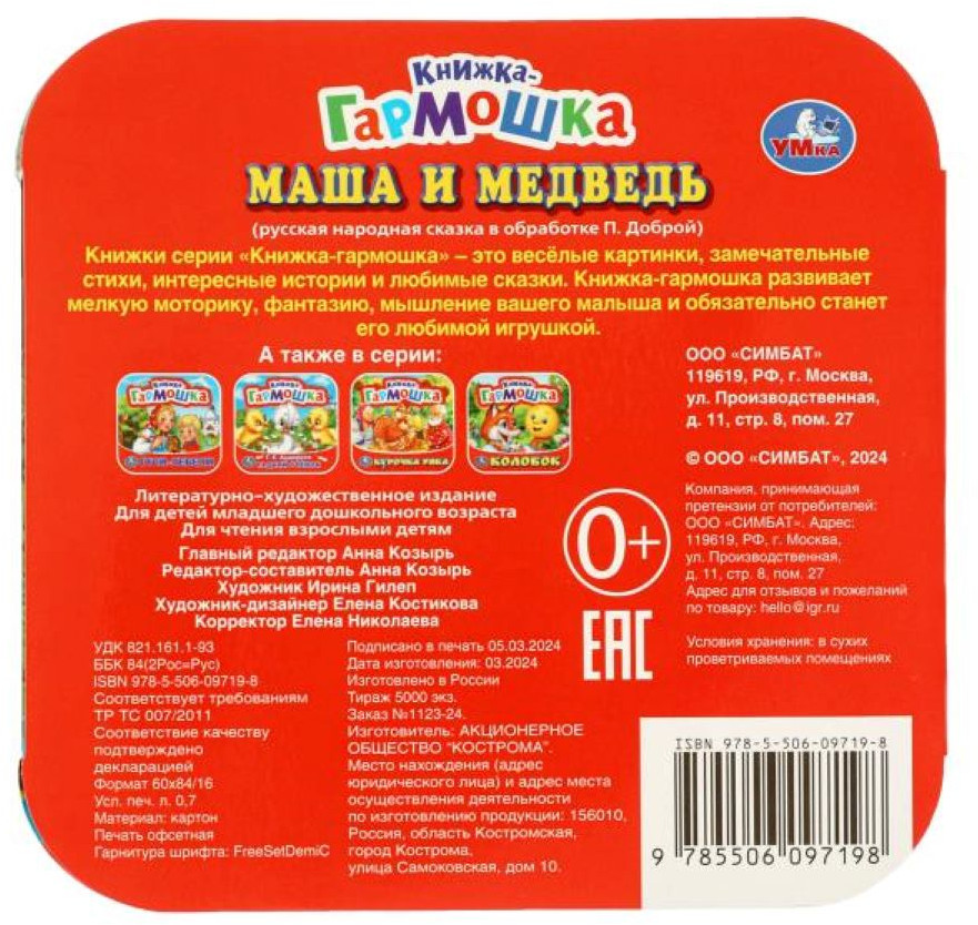 💳 Оплатить за товар можно при получении 🇰🇿 Есть бесплатная доставка по Казахстану 🎁 Копите бонусы с каждой покупки Серия: Книжка-гармошка Книжка-гармошка «Маша и медведь» ТМ «УМка» непременно понравится вашему малышу. Ребёнок с удовольствием будет разглядывать яркие картинки и слушать интересную сказочную историю, которую ему прочитают взрослые. Страницы книжки, выполненные из картона, собраны в гармошку: их легко листать, а также можно распрямить во всю длину. Благодаря компактному размеру в собранном виде издание удобно брать с собой в путешествие. Чтение и игра с книжкой-гармошкой ТМ «УМка» способствуют развитию: мышления, моторики, внимания, памяти и фантазии. |